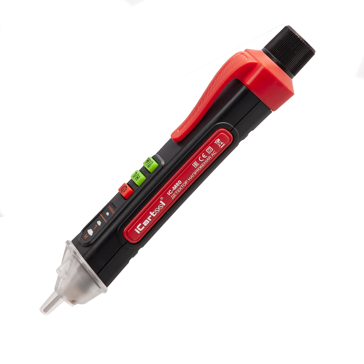 iCartool IC-M80 - бесконтактный тестер для обнаружения напряжения переменного тока в пределах от 12 до 1000 В. Детектор напряжения выполнен в прочном компактном корпусе в виде ручки и имеет стандарт защиты CAT III 1000V, CAT IV 600V. Индикатор напряжения имеет регулировку режимов чувствительности, звуковое и цветовое оповещение. Оснащен светодиодным фонариком и лазерной указкой.