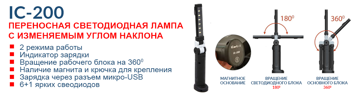 - iCartool IC-200 — переносная лампа с изменяемым углом наклона (основной и торцевой свет, Li-ion, micro-USB)