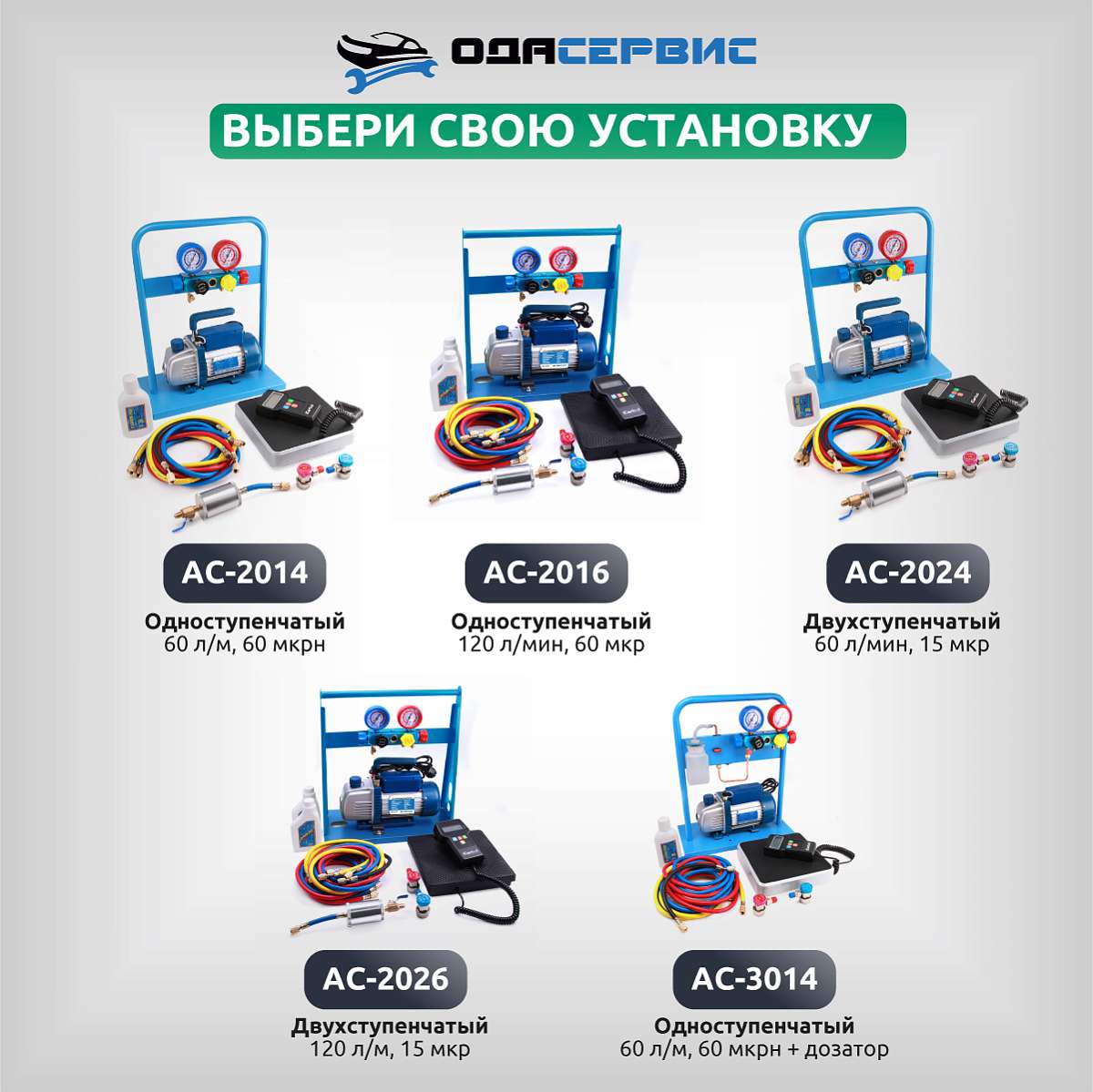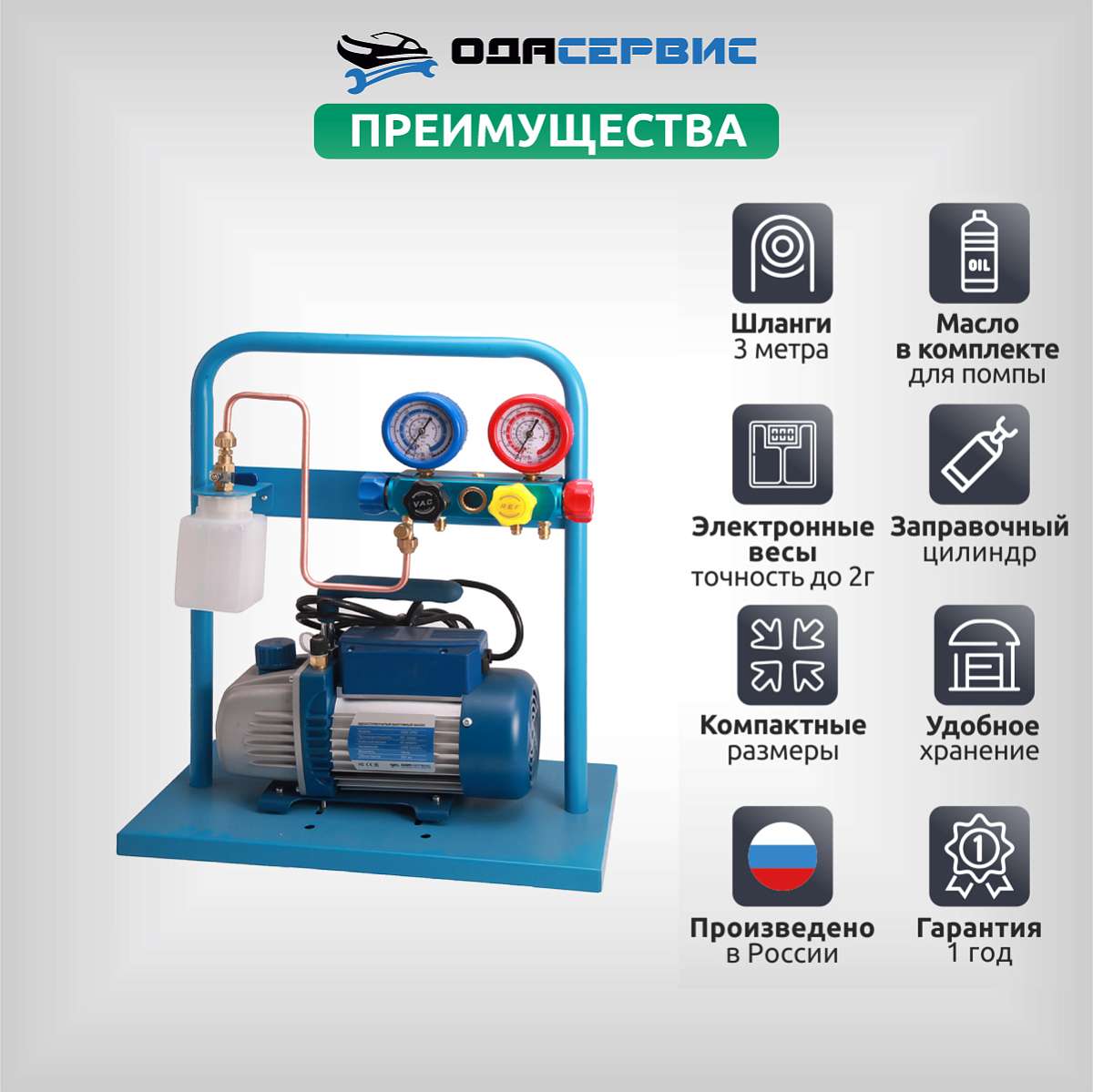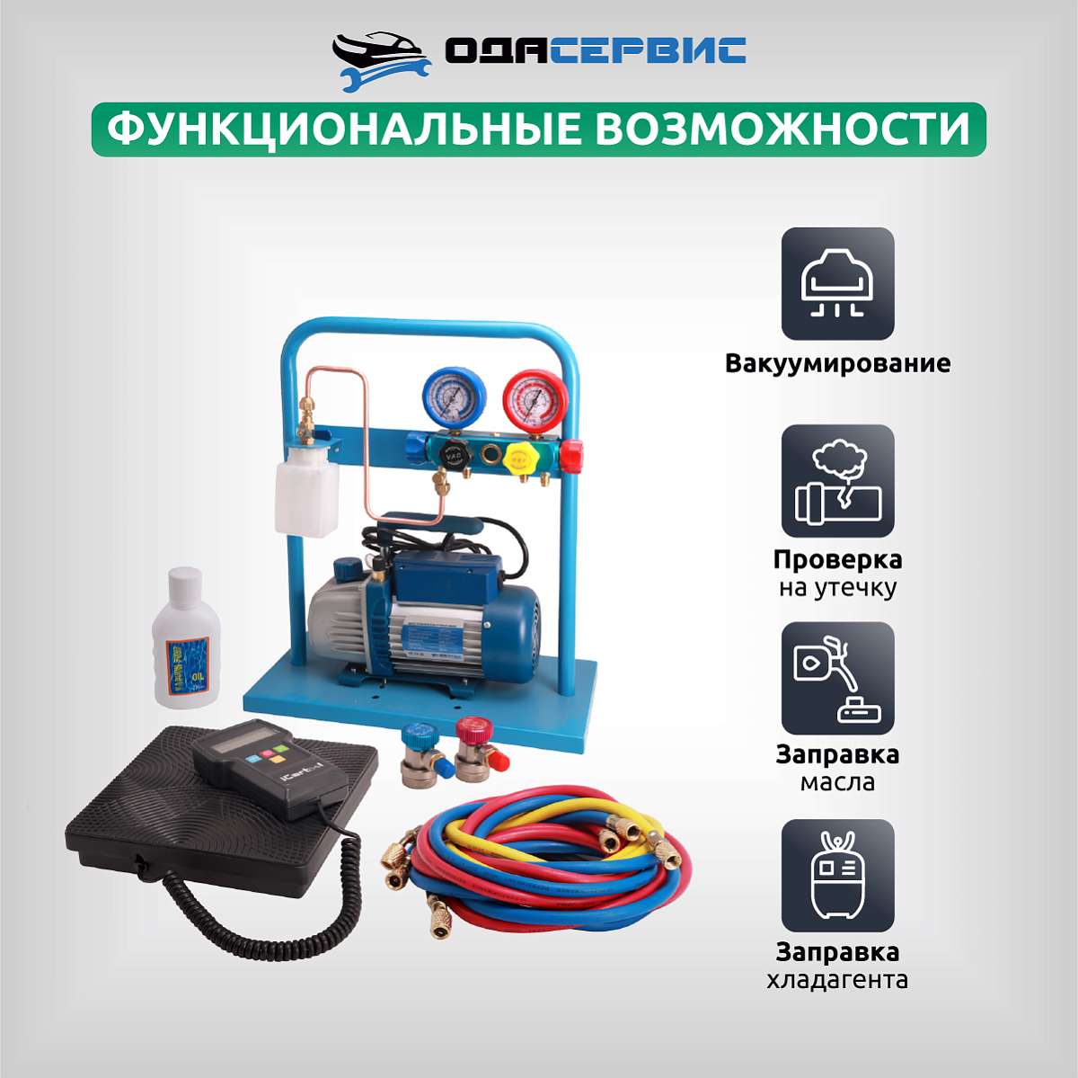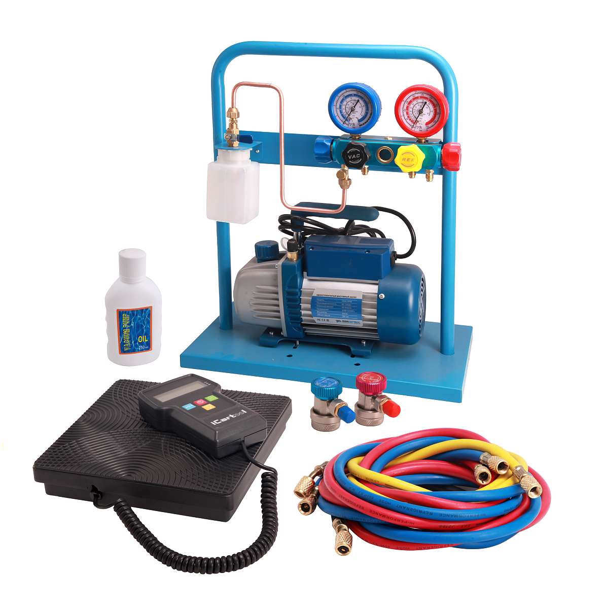 Установка создана на базе 4-х вентильного коллектора и одноступенчатого вакуумного насоса с производительностью 60 л/мин. В комплект также входят 4 заправочных шланга различной длины ( 3м - 2шт., 1,5м - 1шт., 0.5м - 1 шт.). Для удобства транспортировки и хранения все компоненты установки установлены на металлической раме.
