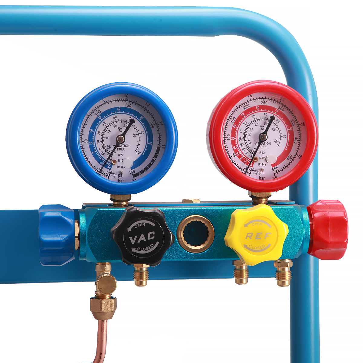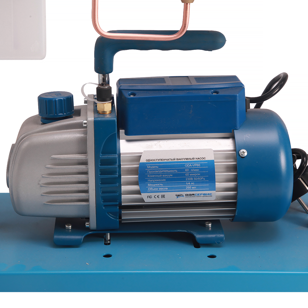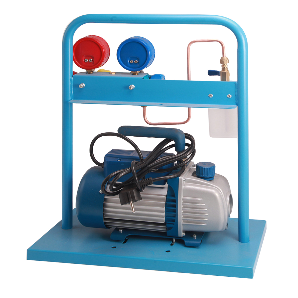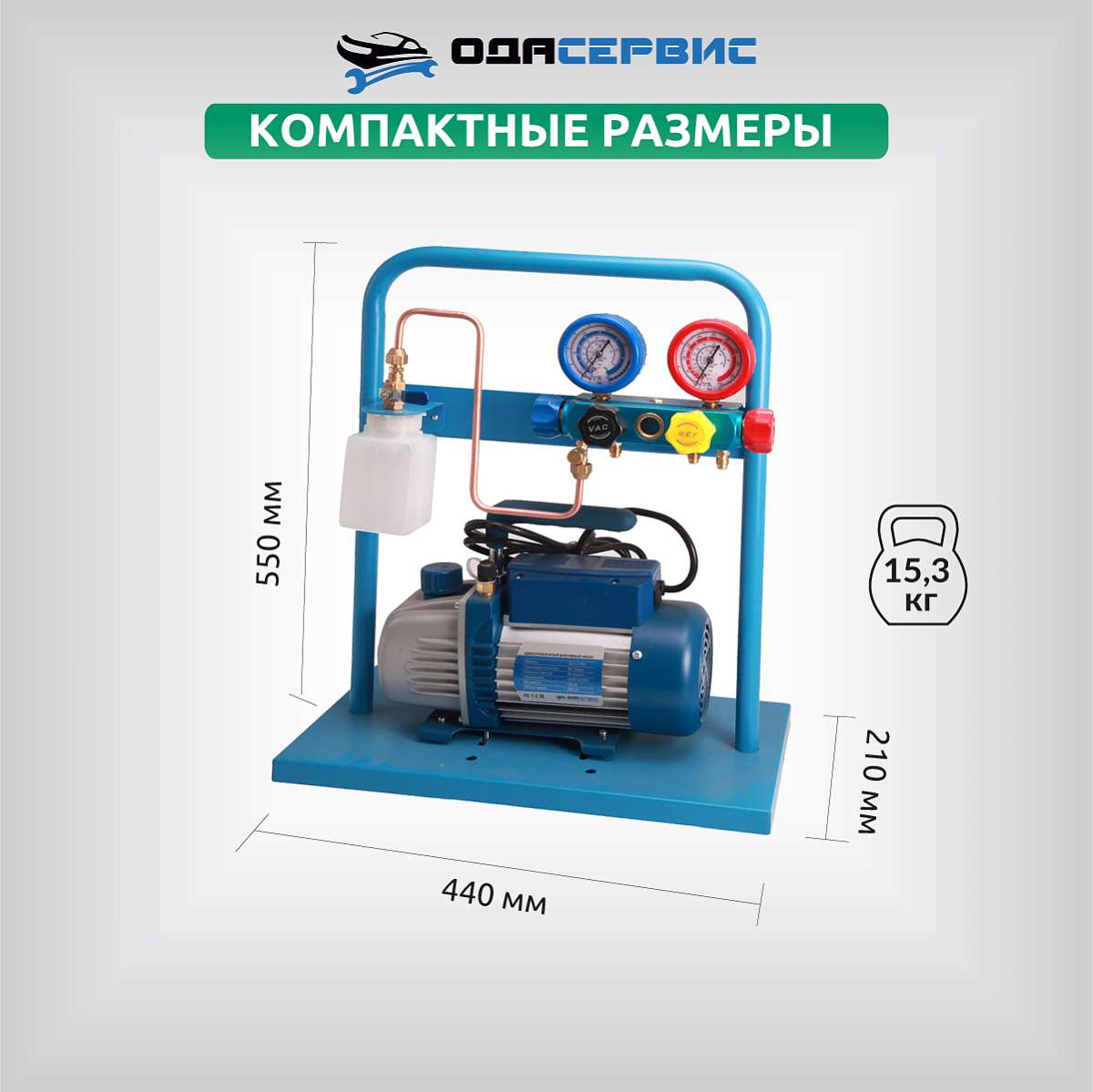 Установка создана на базе 4-х вентильного коллектора и одноступенчатого вакуумного насоса с производительностью 60 л/мин. В комплект также входят 4 заправочных шланга различной длины ( 3м - 2шт., 1,5м - 1шт., 0.5м - 1 шт.). Для удобства транспортировки и хранения все компоненты установки установлены на металлической раме.