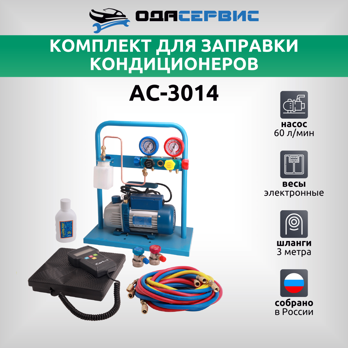 Комплект АС-3014 предназначен для обслуживания автомобильных кондиционеров любых видов транспортных средств с системой кондиционирования, работающей на хладагенте R134a.