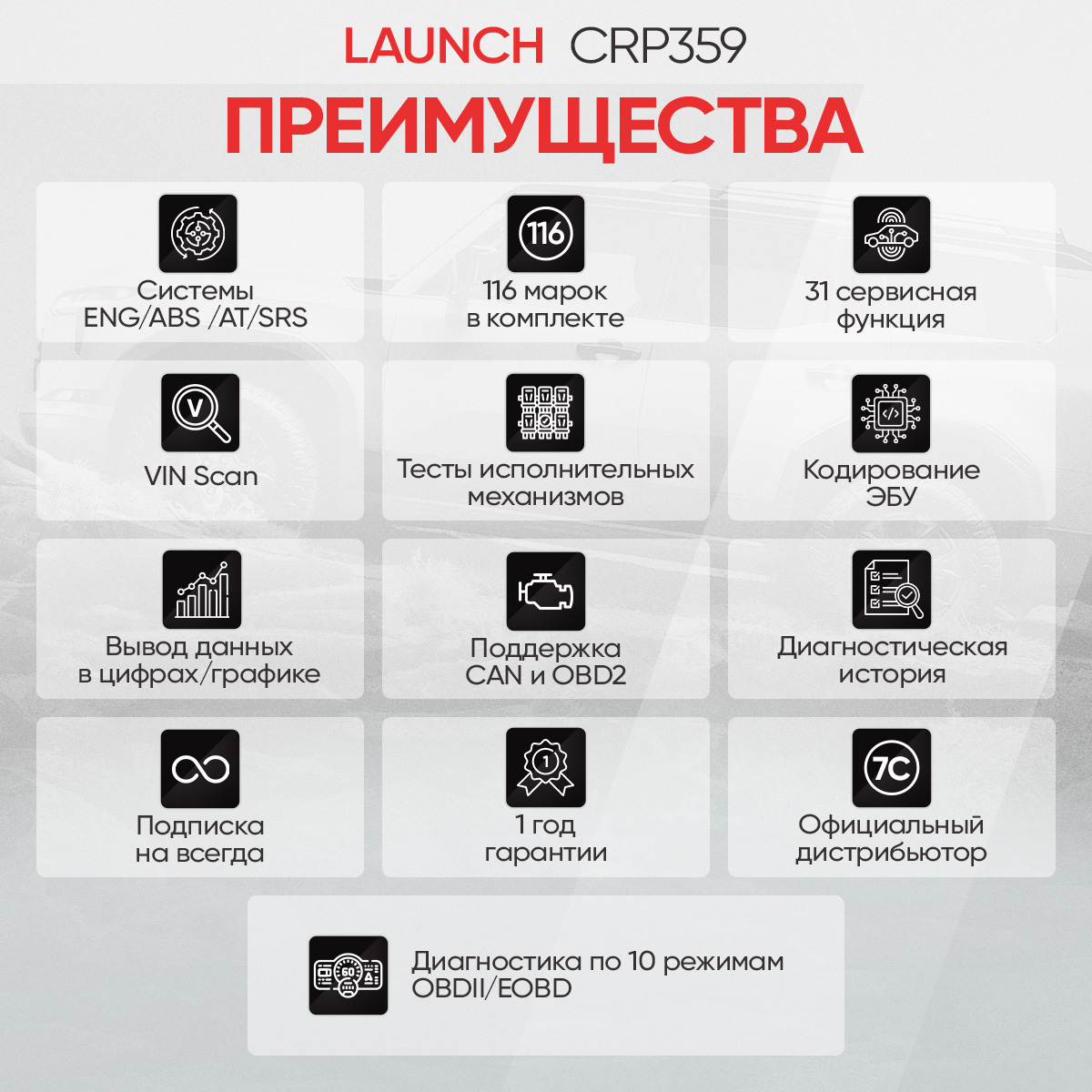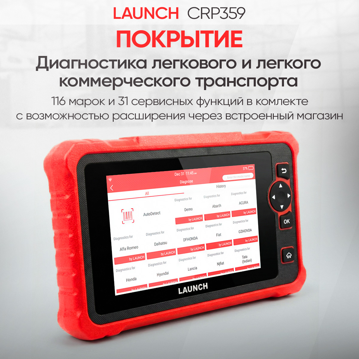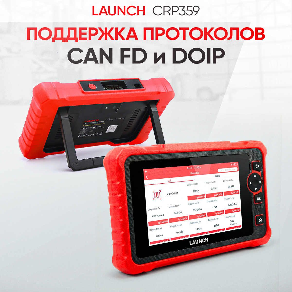 Launch CRP 359 - новый диагностический сканер в линейке Launch Creader Professional. В первую очередь, сканер предназначен для сервисного обслуживания современных легковых автомобилей, в том числе там, где используется протоколы DoIP и CAN FD. Сканер отлично подойдет мастерам-приемщикам и механикам. В базовый комплект ПО входит 116 марок с возможностью диагностики всех систем и 31 сервисная функция в меню для быстрого доступа.