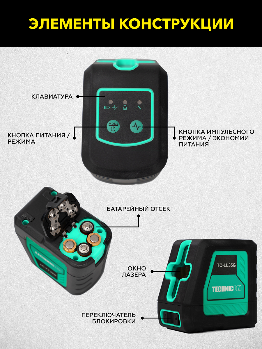 Лазерный уровень TC-LL35G предназначен для построения световых линий на вертикальных или горизонтальных плоскостях помещения. Позволяет ускорить с высокой точностью разметку стен, пола или потолка жилых, или общественных помещений. Данный уровень имеет компактные размеры и небольшой вес. Прост в управлении. При всём при этом обладает повышенной степенью влагозащиты IP54. Для удобной эксплуатации, в функционале лазерного уровня предусмотрены несколько режимов: горизонталь, вертикаль и перекрестье, 3 уровня интенсивности свечения. Будучи высокоточным прибором, лазерный уровень TC-LL35G оснащен функцией автоматического самовыравнивания +/- 4°и обеспечивает точность измерений +/-2,5 мм. Цвет лазерного луча зеленый, а дальность построения составляет 30 метров. Кроме того, для оповещения пользователя предусмотрены световая и звуковая индикация.