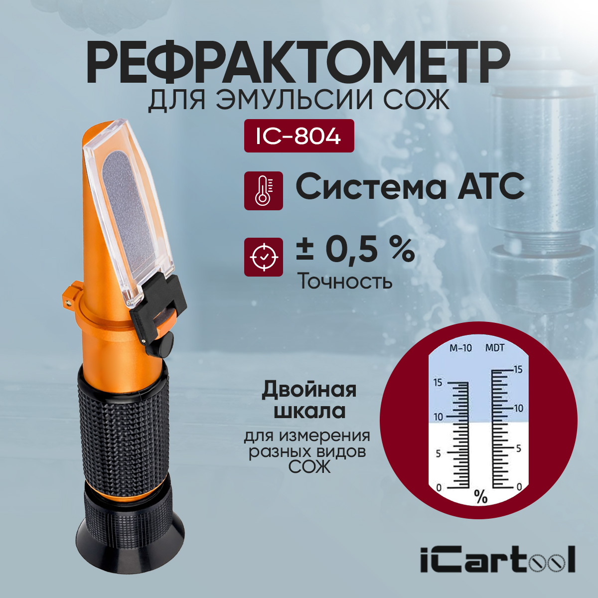 Рефрактометр СОЖ iCartool IC-804 — ручной оптический прибор для контроля концентрации смазочно-охлаждающих жидкостей (водосмешиваемых эмульсий) по принципу преломления света. Он помогает быстро оценить состояние СОЖ на производстве, понять, насколько корректно приготовлена эмульсия, и вовремя заметить ухудшение её свойств.