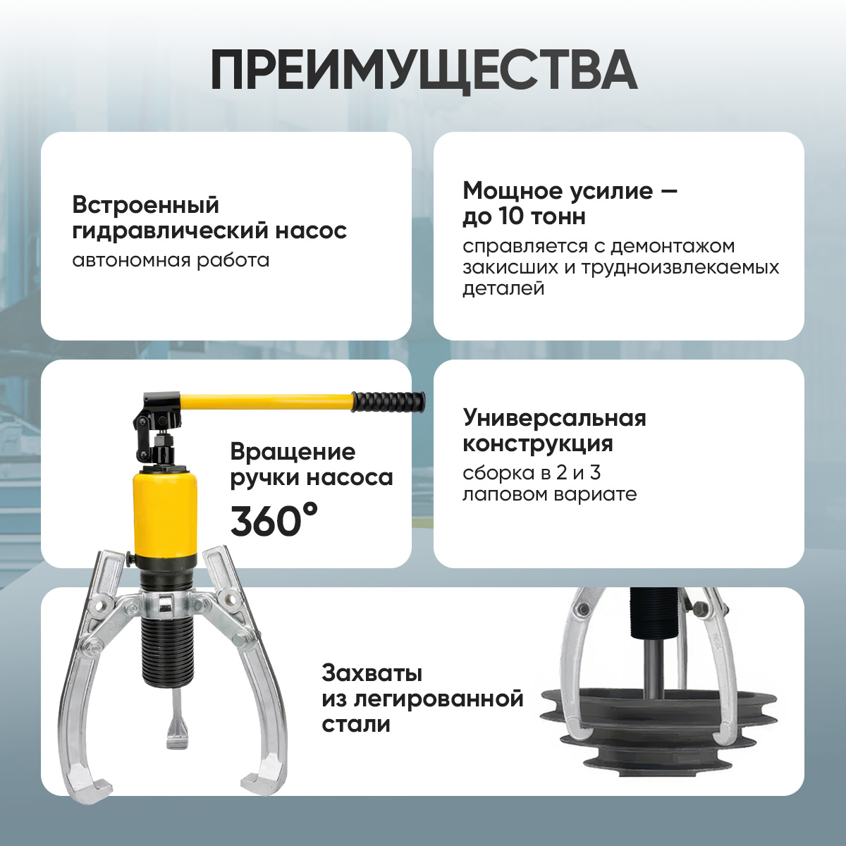 - Выносной гидравлический насос: повышает мобильность и удобство работы, позволяет использовать съёмник в ограниченном пространстве.