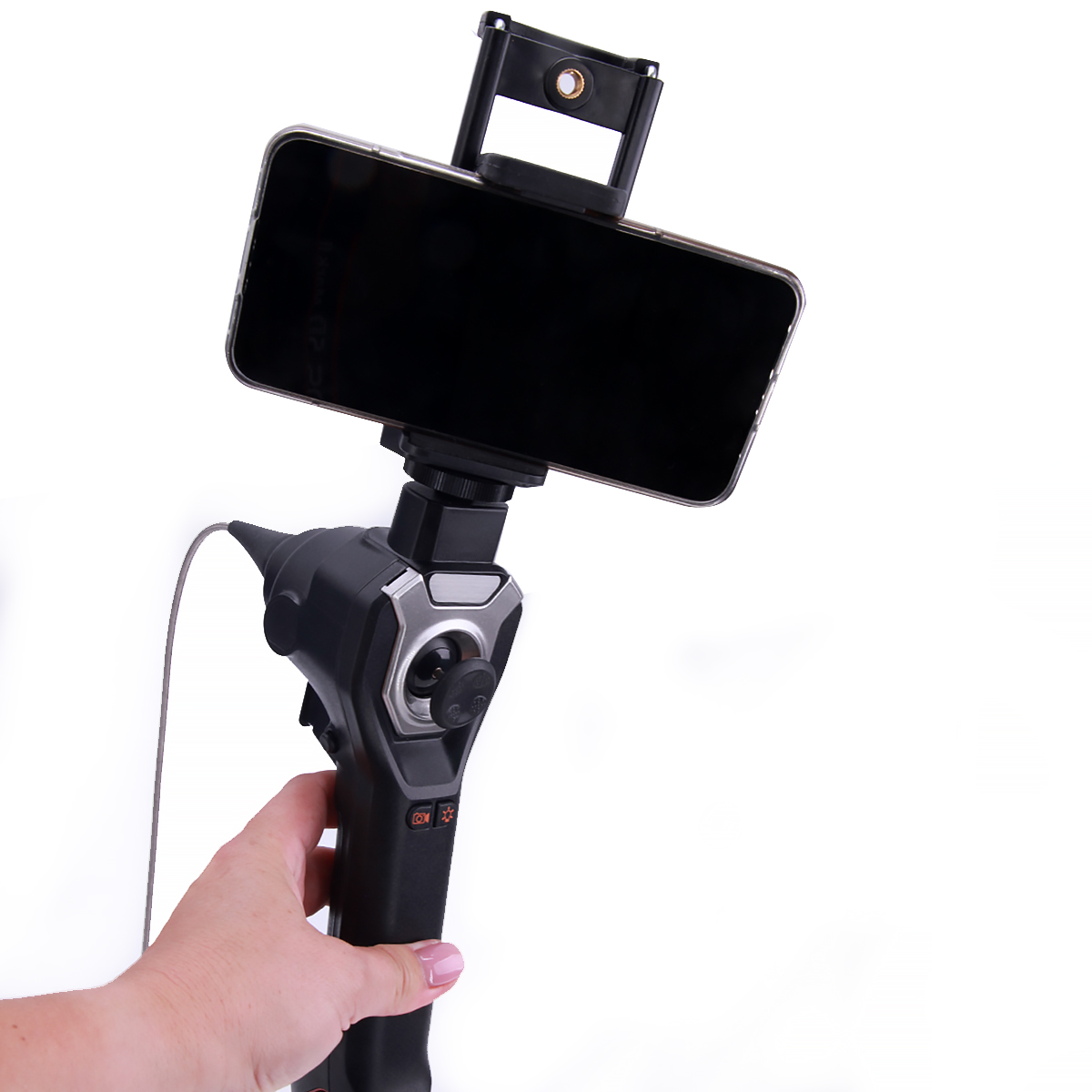 Камера с разрешением 1 Мп имеет автоматическую фокусировку в диапазоне от 1 см. Для работы в темных местах предусмотрена регулируемая LED подсветка с 3 уровнями яркости. Корпус эндоскопа легкий, удобно лежит в руке, оснащен собственным аккумулятором для продолжительной работы. Держатель смартфона съемный, имеет 2 варианта крепления к корпусу (вертикально и горизонтально) и надежно удерживает мобильное устройство (телефон/планшет) шириной до 18 см.