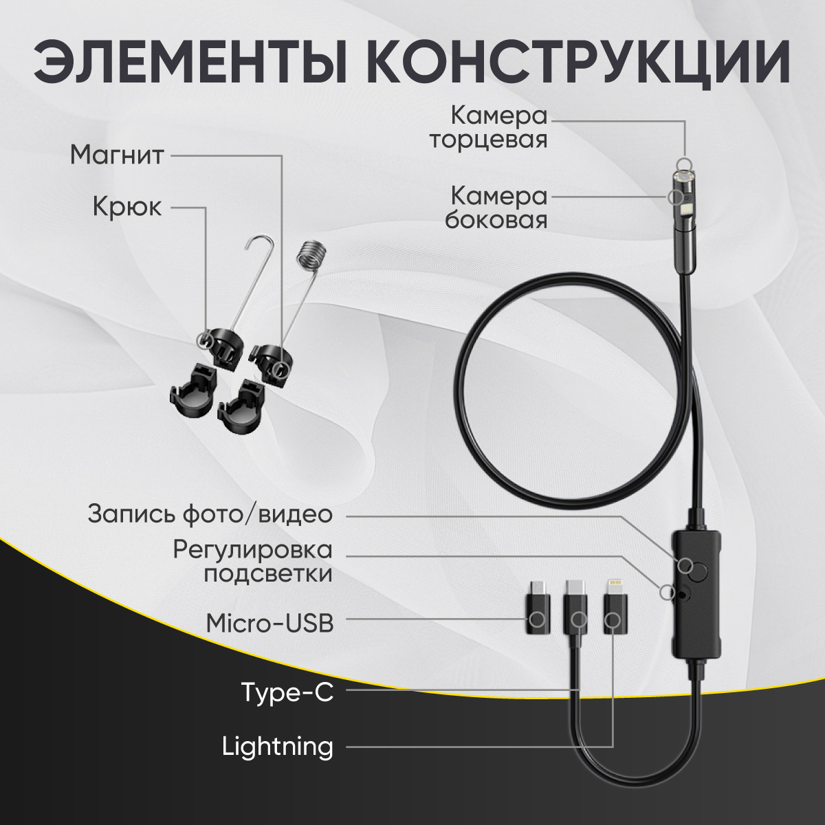 Прибор оснащен разъемом USB Type-C и переходниками Lightning и Micro-USB, благодаря чему совместим почти со всеми смартфонами/планшетами на базе iOS/Android. Питание осуществляется за счет устройства, к которому подключен эндоскоп.