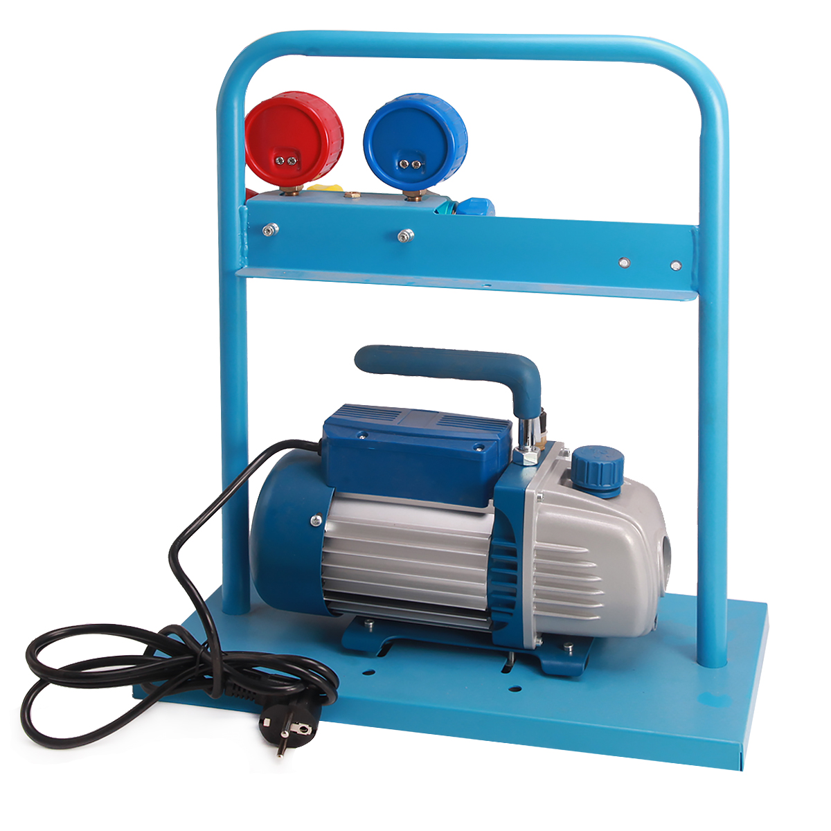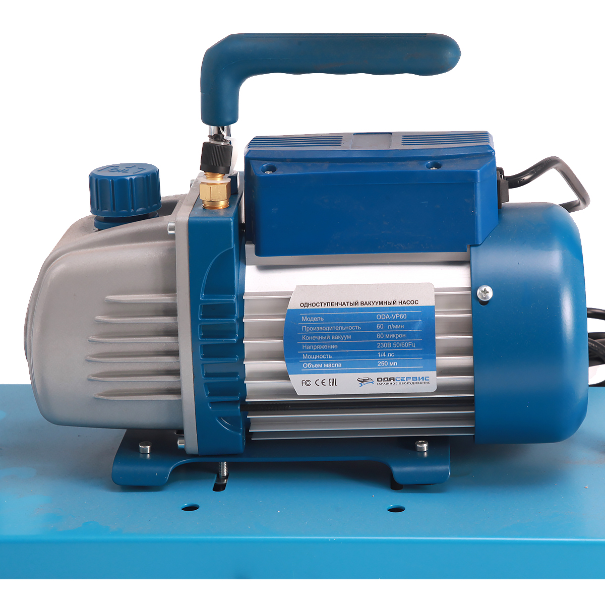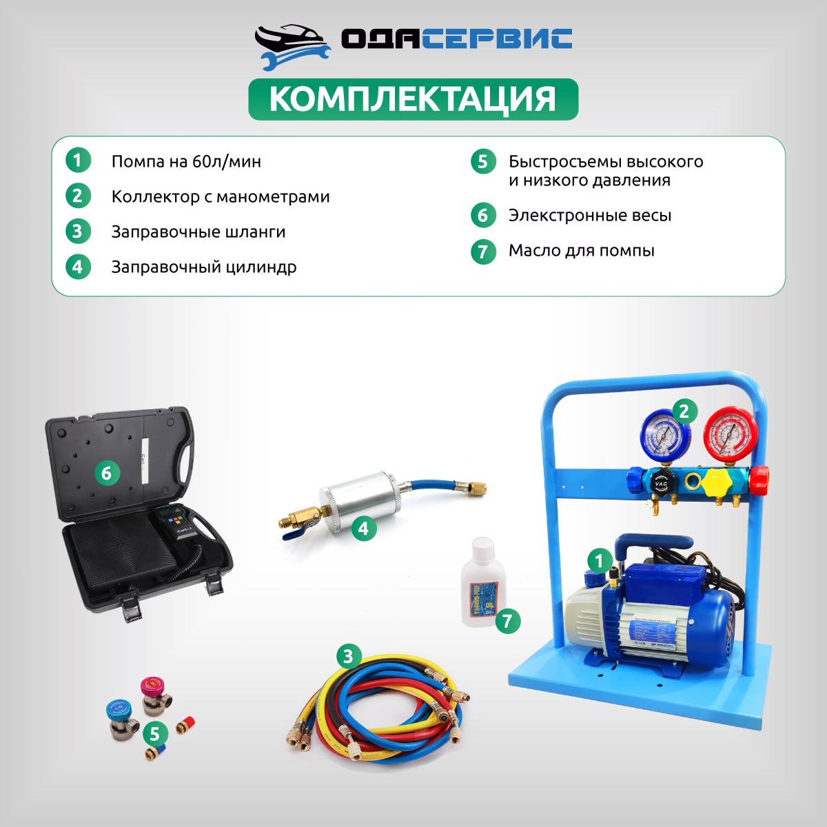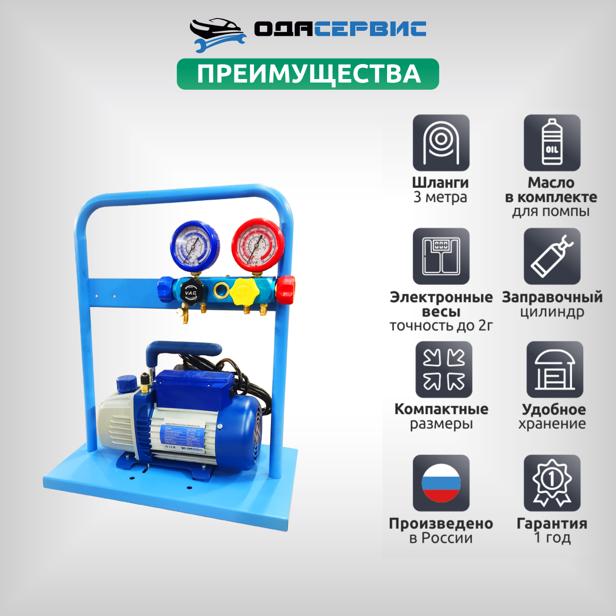 Установка создана на базе 4-х вентильного коллектора и вакуумной помпы. В зависимости от модели, установка комплектуется одноступенчатой или двухступенчатой вакуумной помпой с производительностью 60 л/мин. В комплект также входят 4 заправочных шланга различной длины ( 3м - 2шт., 1,5м - 1шт., 0.5м - 1 шт.). Для удобства транспортировки и хранения все компоненты установки установлены на металлической раме.
