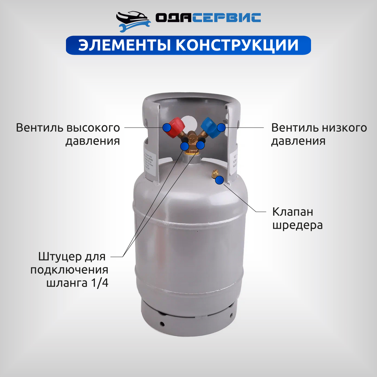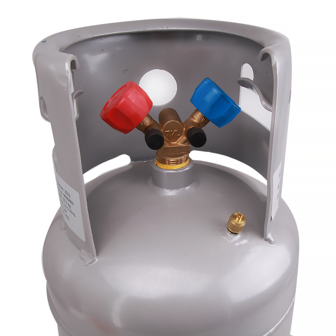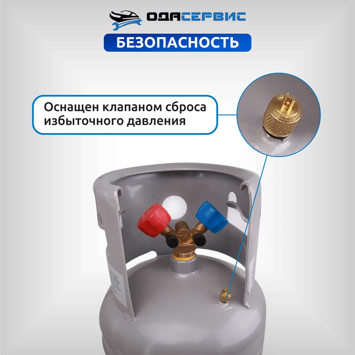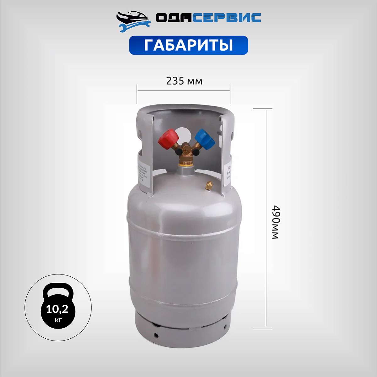 Оснащен клапаном Шредера и двухвентильным коллектором: синий кран - паровая фаза, красный кран - жидкая фаза.