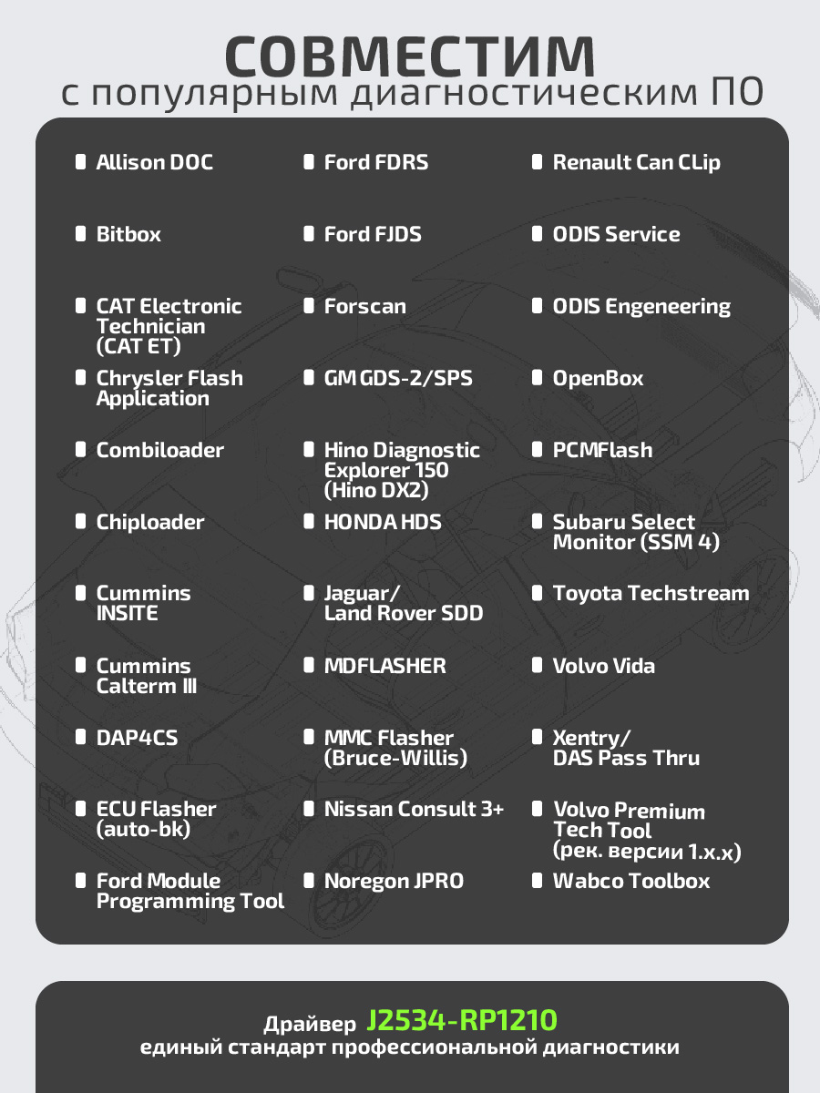 • Драйвер J2534-RP1210 для адаптера SM3 даёт возможность работы с большим числом сторонних программ, поддерживающих работу через интерфейс J2534: Allison DOC, Bitbox, CAT Electronic Technician (CAT ET), Chrysler Flash Application, Combiloader, Chiploader, Cummins INSITE, Cummins Calterm III, DAP4CS, ECU Flasher (auto-bk), Ford Module Programming Tool, Ford FDRS, Ford FJDS, Forscan, GM GDS-2/SPS, Hino Diagnostic Explorer 150 (Hino DX2), HONDA HDS, Jaguar/Land Rover SDD, MDFLASHER, MMC Flasher (Bruce-Willis), Nissan Consult 3+, Noregon JPRO, Renault Can CLip, ODIS Service, ODIS Engeneering, OpenBox, PCMFlash, Subaru Select Monitor (SSM 4), Toyota Techstream, Volvo Vida, Xentry/DAS Pass Thru, Volvo Premium Tech Tool (рекомендованы версии 1.х.х), Wabco Toolbox.
