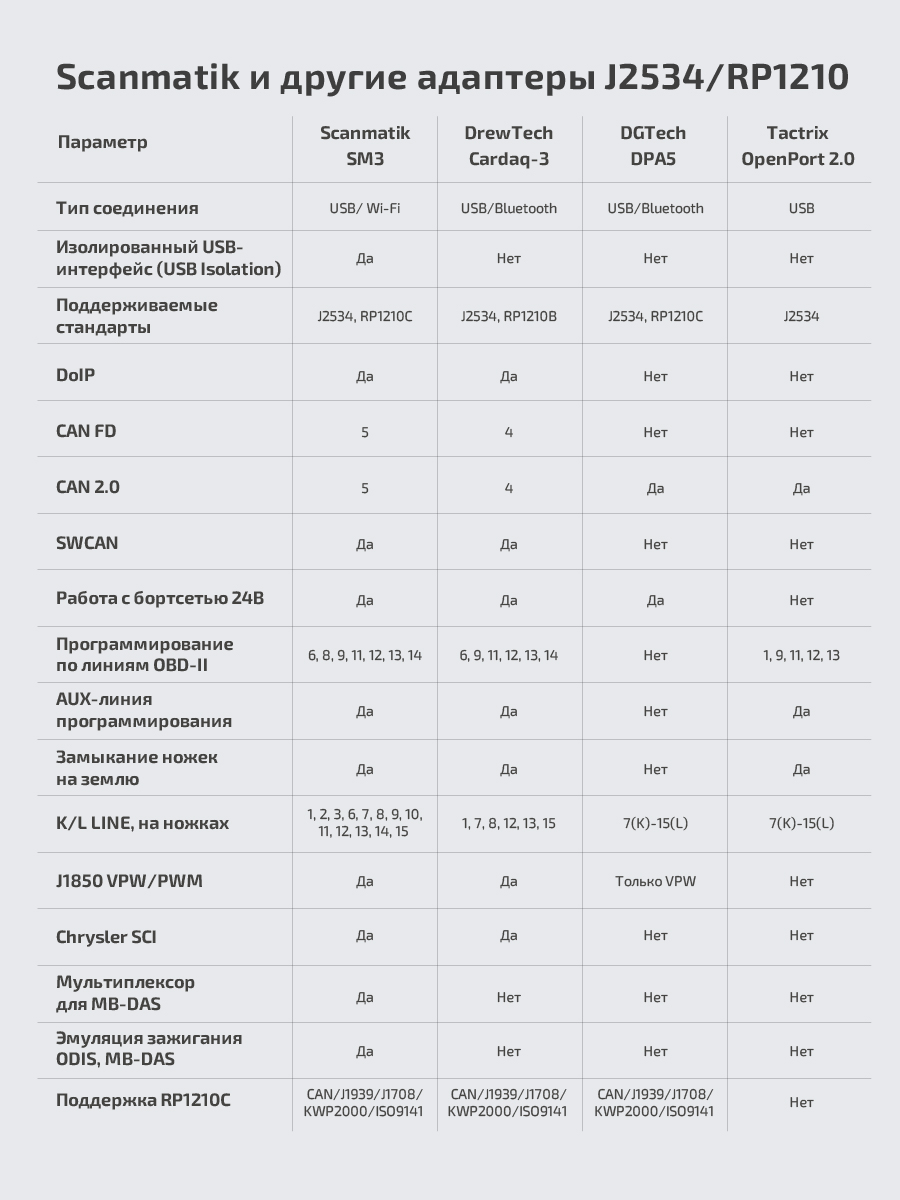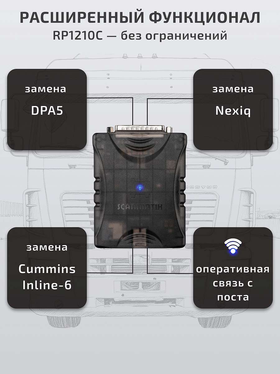 • Реализация стандарта RP1210C - без каких либо ограничений. SM3 полностью заменяет приборы DPA5/Nexiq/Inline-6 с поддержкой всех протоколов и гораздо более шустрым и удобным соединением по Wi-Fi.