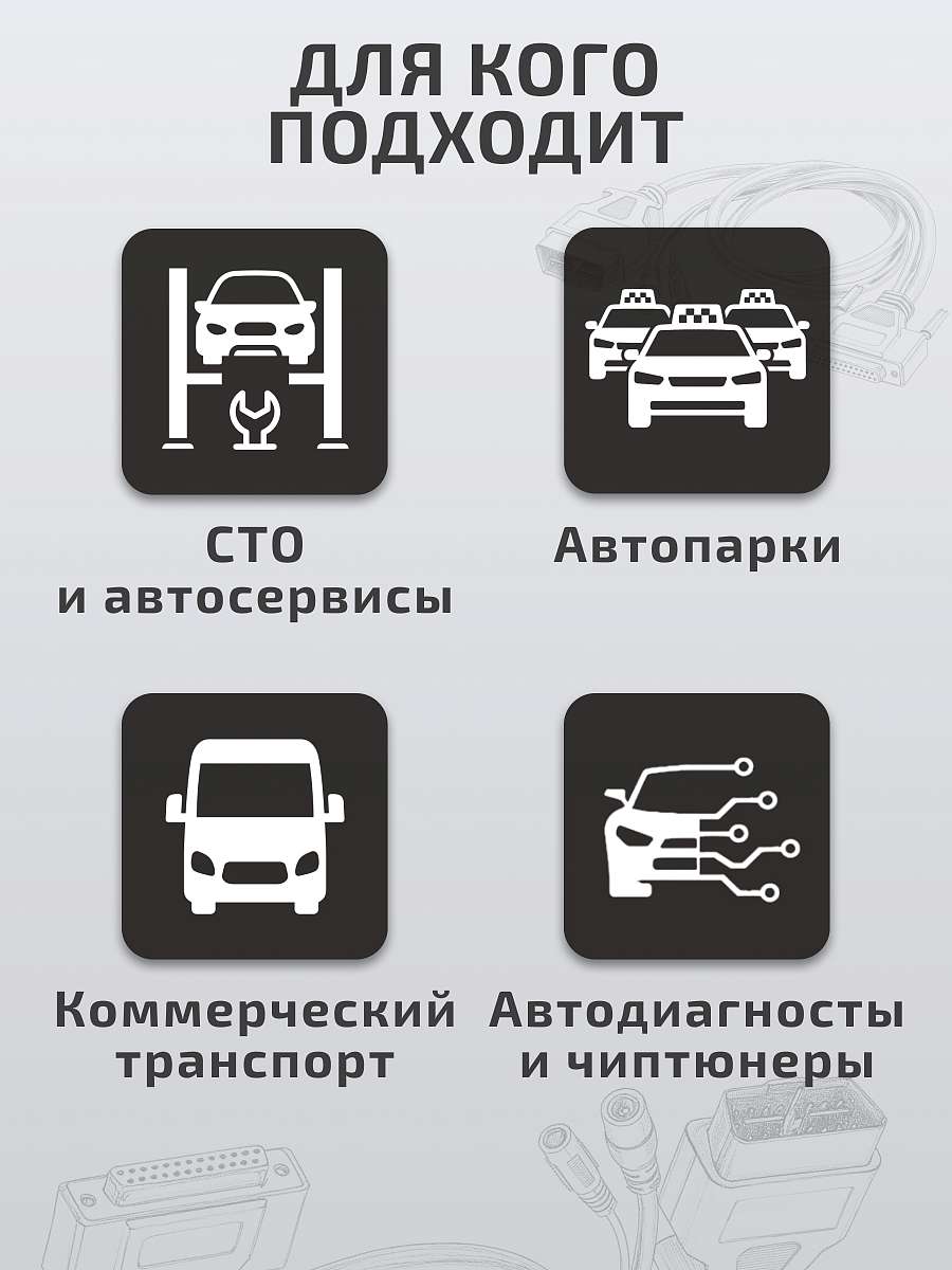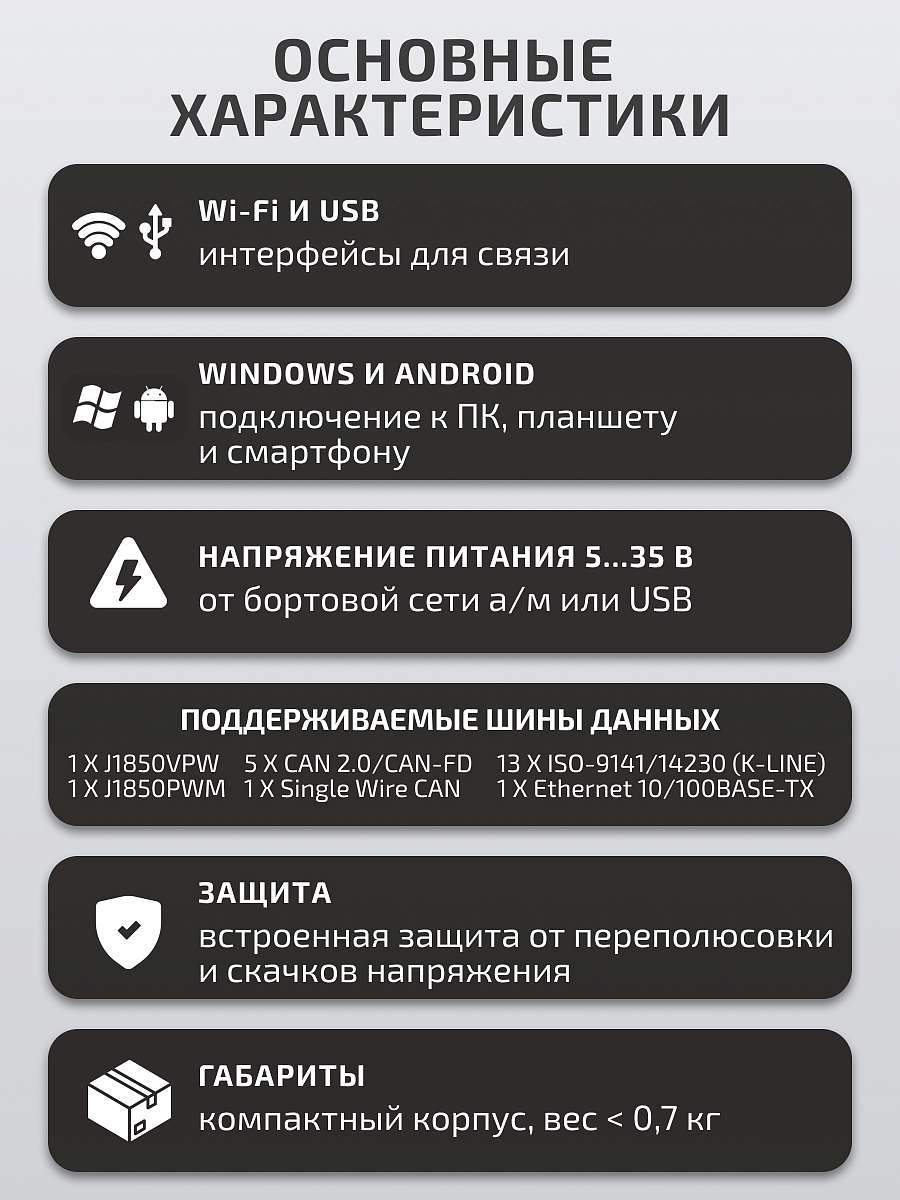 • Раздельные входы питания от диагностической колодки и АКБ / прикуривателя позволяют избежать короткого замыкания в бортовой сети а/м