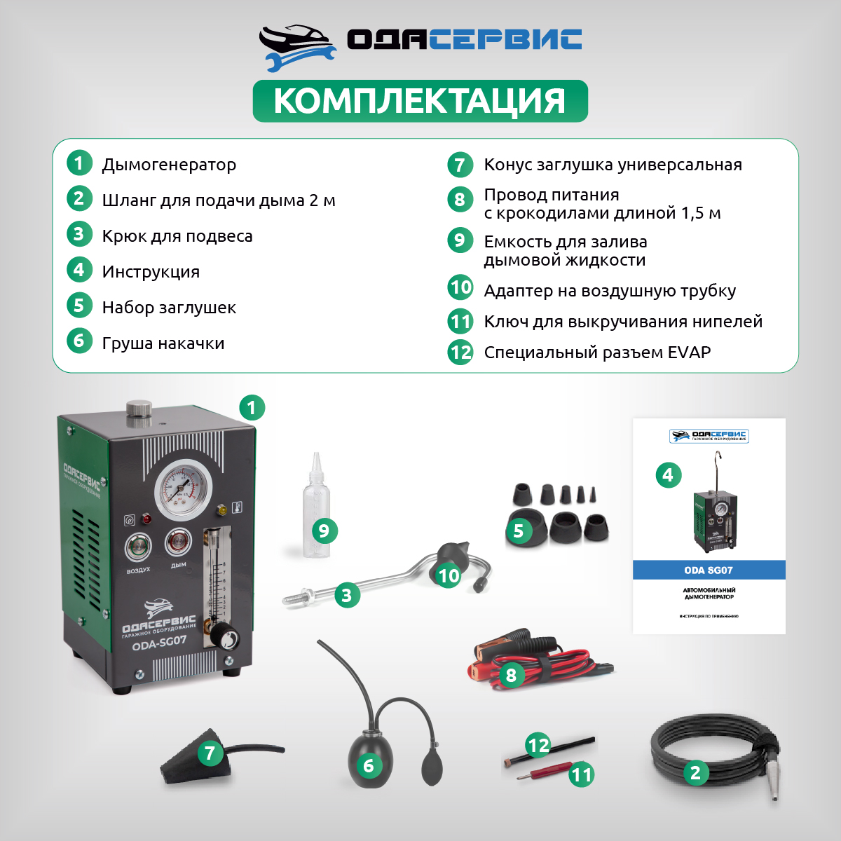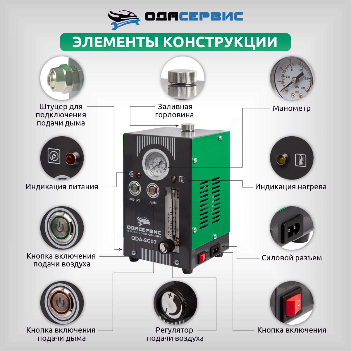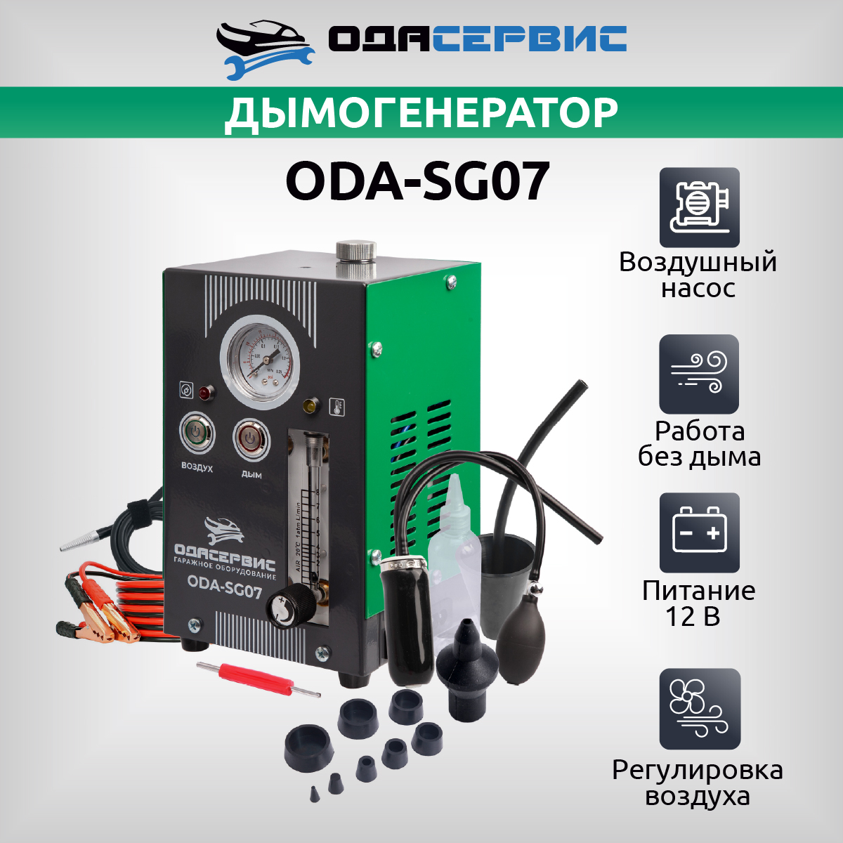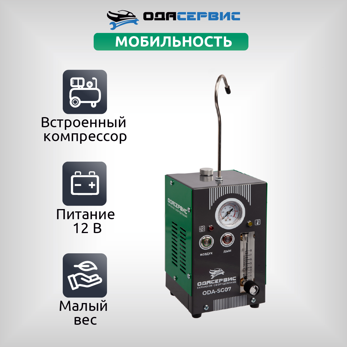 Дымогенератор ODA-SG07 со встроенным компрессором представляет собой легкий, компактный не требующий питания 220В прибор, имеющий два режима работы «Воздух» и «Дым» для оперативной диагностики автомобиля и эффективного обнаружения проблемы утечек «подсосов» воздуха в различных системах, требующих герметичность.