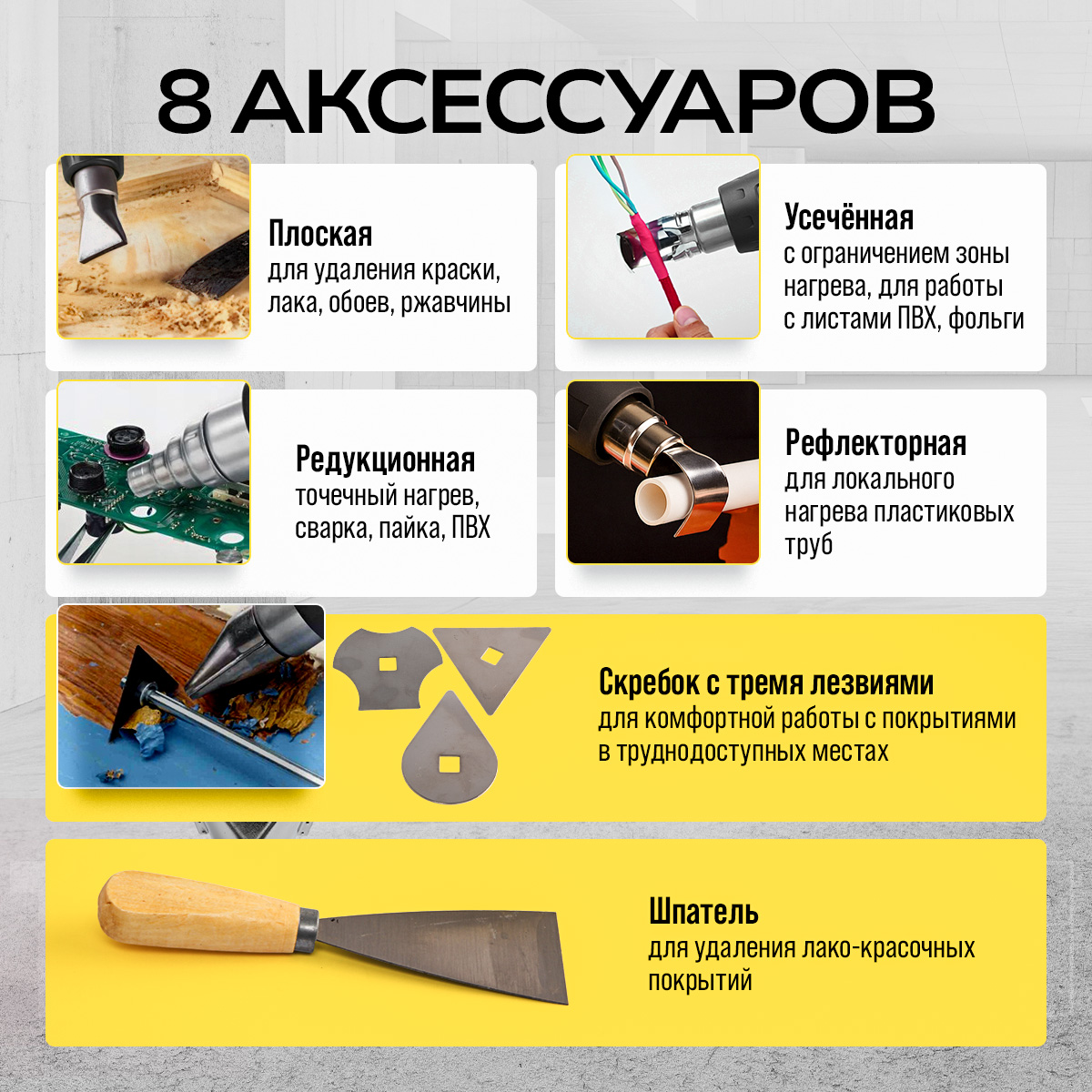 С феном поставляется набор из 8 аксессуаров, а также кожух для защиты от ожогов — он экранирует горячий поток и снижает риск случайного касания. В комплект также входят специализированные сопла для концентрированного нагрева, распределения воздуха по широкой полосе, отвода тепла от чувствительных зон. Весь набор удобно хранить и перевозить в прочном пластиковом кейсе, а кабель 2 м даёт свободу перемещения без постоянных перестановок удлинителя.