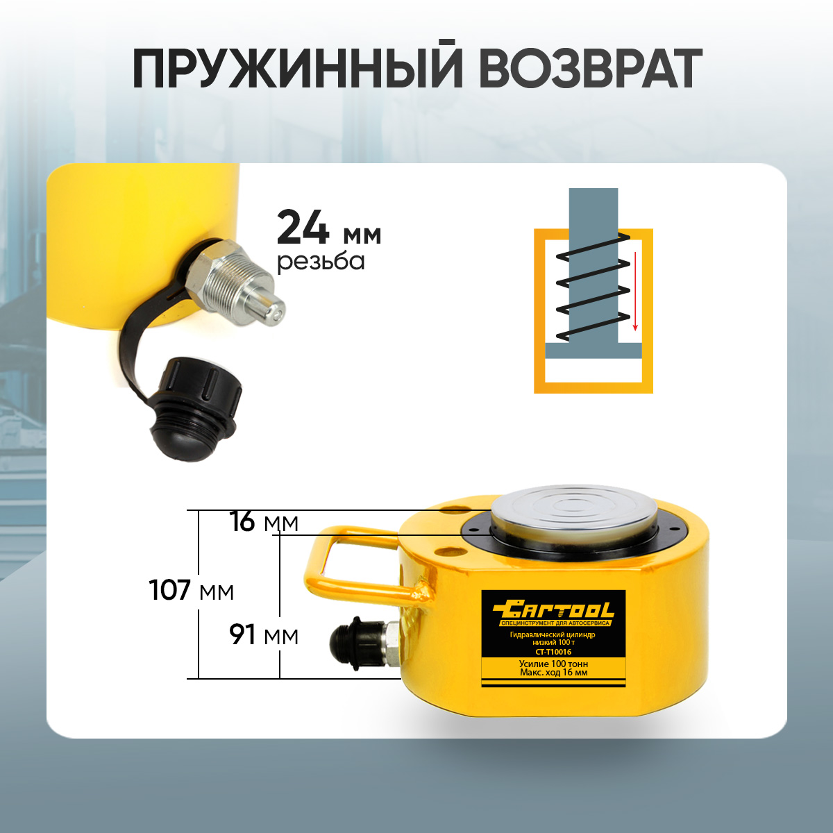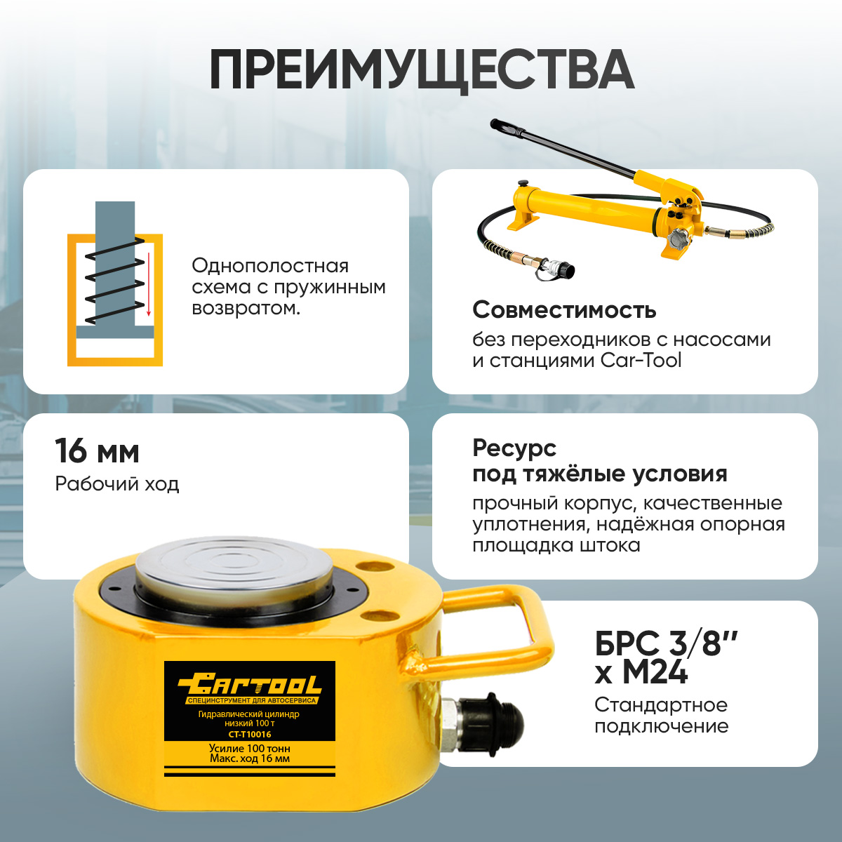 - Совместимость. Работает со всеми насосами и гидравлическими станциями Car-Tool и другими насосами с БРС М24.