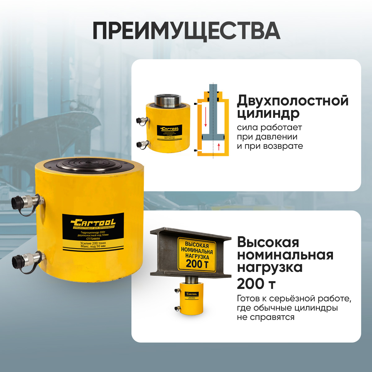 - Высокая номинальная нагрузка 200 т — готов к серьёзной работе, где обычные цилиндры не справятся
