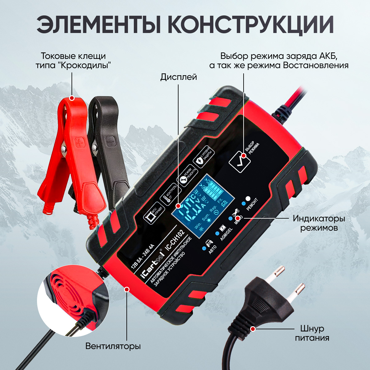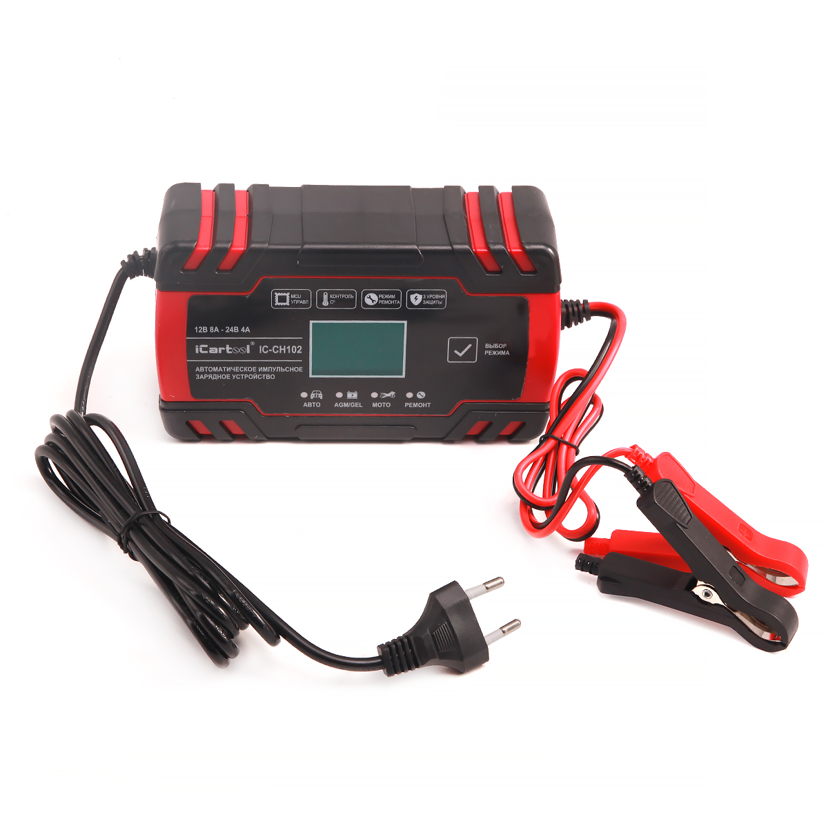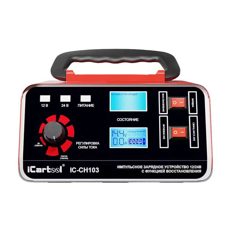 Автоматическое импульсное устройство 2 в 1 iCartool IC-CH102 предназначено для заряда и восстановления всех типов свинцово-кислотных аккумуляторных батарей (АКБ) 12В/24В, включая АКБ типов AGM/GEL.