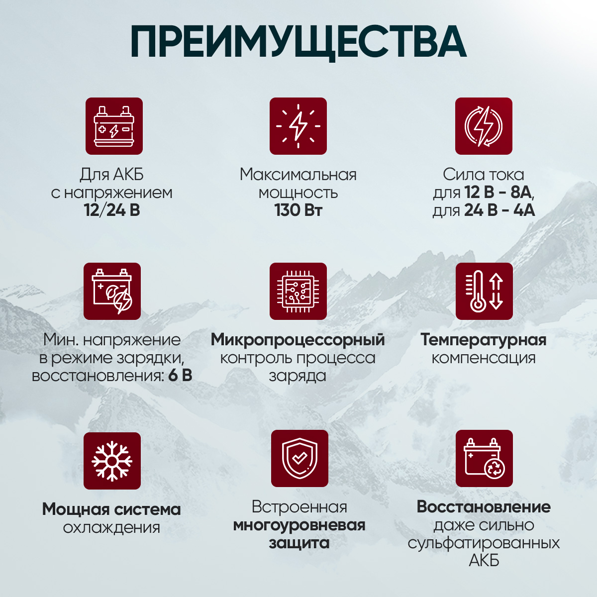 | Типы заряжаемых АКБ | Все типы свинцово-кислотных АКБ, включая AGM/GEL | Свинцово-кислотные АКБ, включая AGM/GEL, залитые, кальциевые, глубокого разряда, VRLA, необслуживаемые, свинцово-кислотные, литиевые (кроме LiFePO4) | Свинцово-кислотные АКБ, AGM, GEL, залитые, кальциевые аккумуляторы глубокого разряда, необслуживаемые свинцово-кислотные аккумуляторы VRLA, LiFePo4 | |