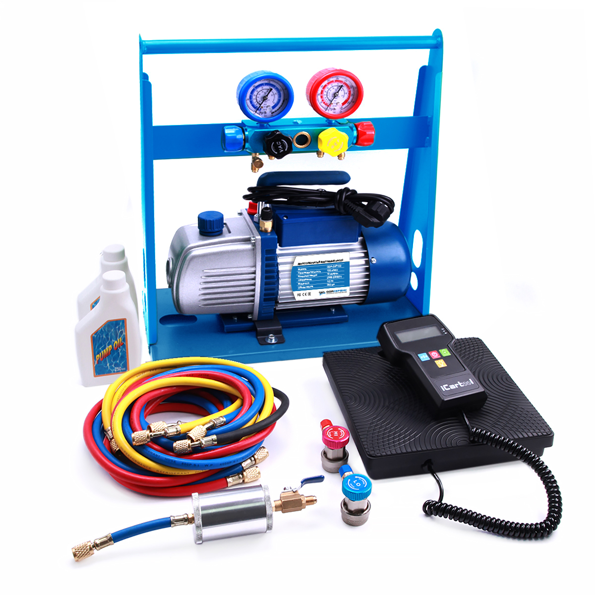 Дополнительно в комплект входят: электронные весы, заправочный цилиндр для масла и набор Г-образных быстросъемных разъемных соединений.