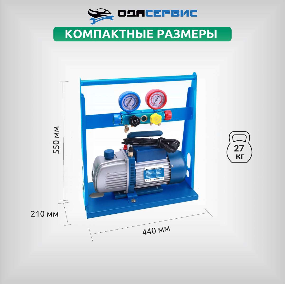 Установка создана на базе 4-х вентильного коллектора и двухступенчатого вакуумного насоса с производительностью 120 л/мин. В комплект также входят 4 заправочных шланга различной длины ( 3м - 2шт., 1,5м - 1шт., 0.5м - 1 шт.). Для удобства транспортировки и хранения все компоненты установки установлены на металлической раме.