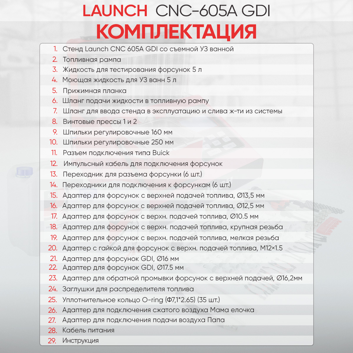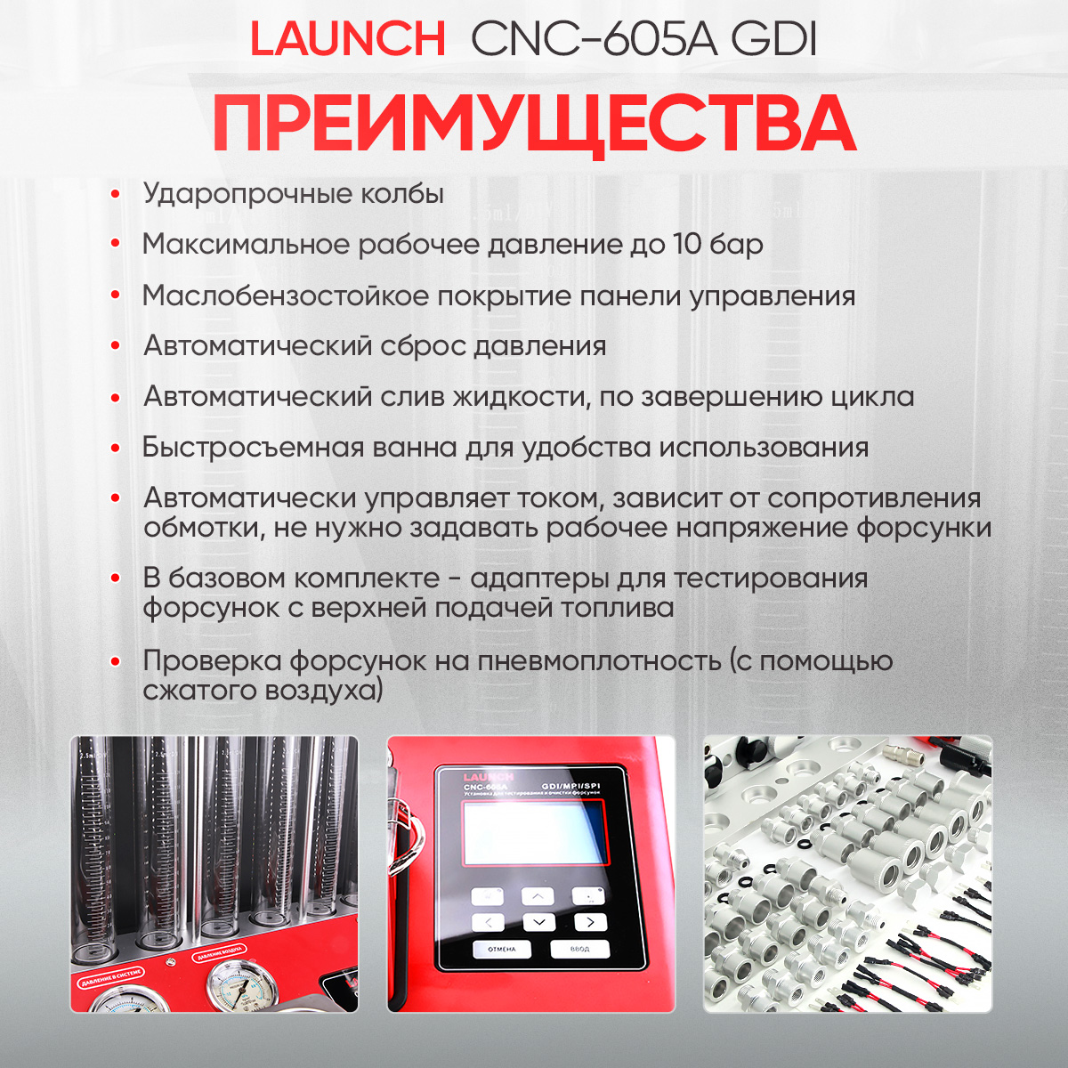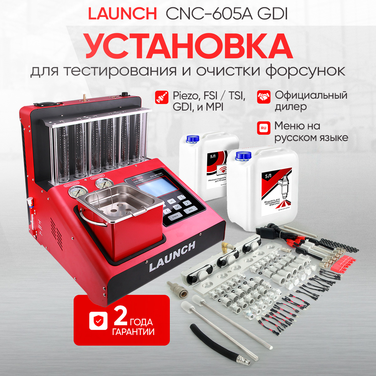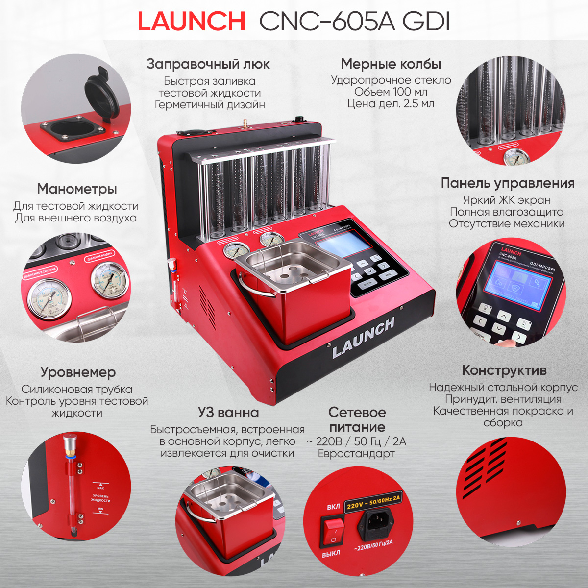 Launch CNC 605A GDI - новая модель в линейке стендов для тестирования и ультразвуковой очистки бензиновых форсунок, в том числе форсунок типа GDI и FSI, от компании Launch. CNC 605A LNC-104 соединил в себе все самое лучшее от своих предшественников. Стенд позволит выявить и устранить практически все неисправности форсунок, связанные с загрязнением и отложениями. С его помощью вы сможете смоделировать работу форсунок на автомобиле, проверить их герметичность и многое другое. Отличительной чертой стенда является тестирование форсунок типа GDI, FSI и т.п.