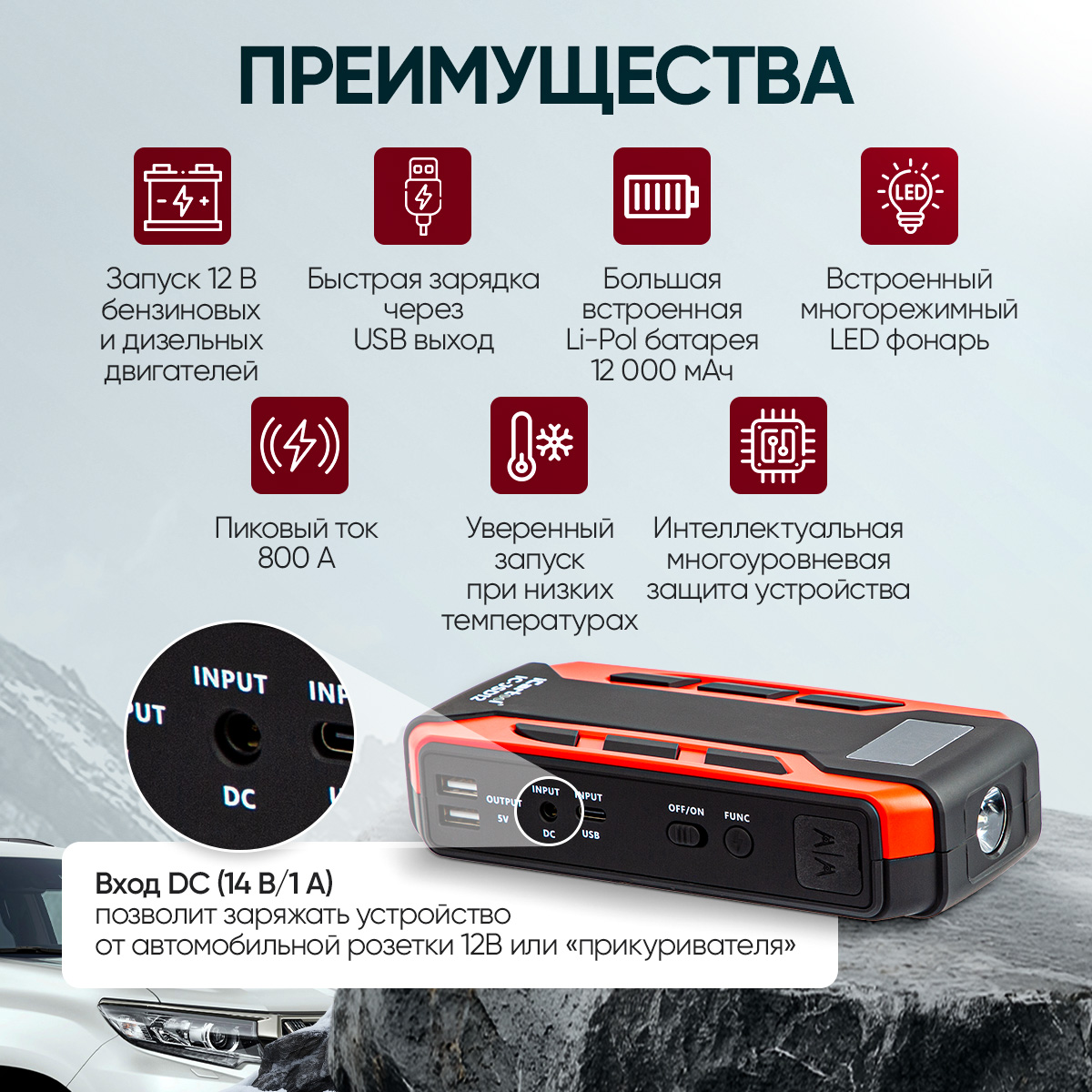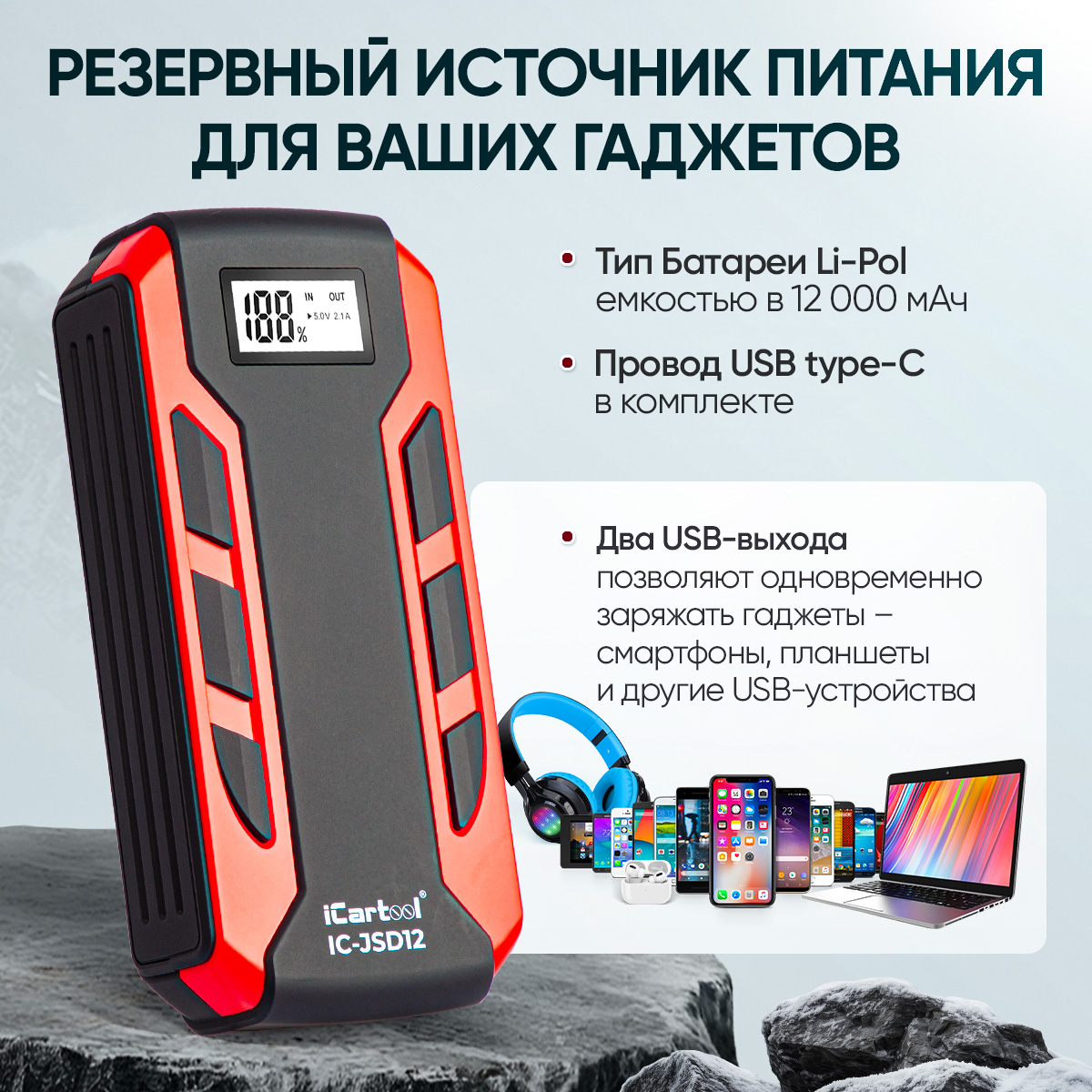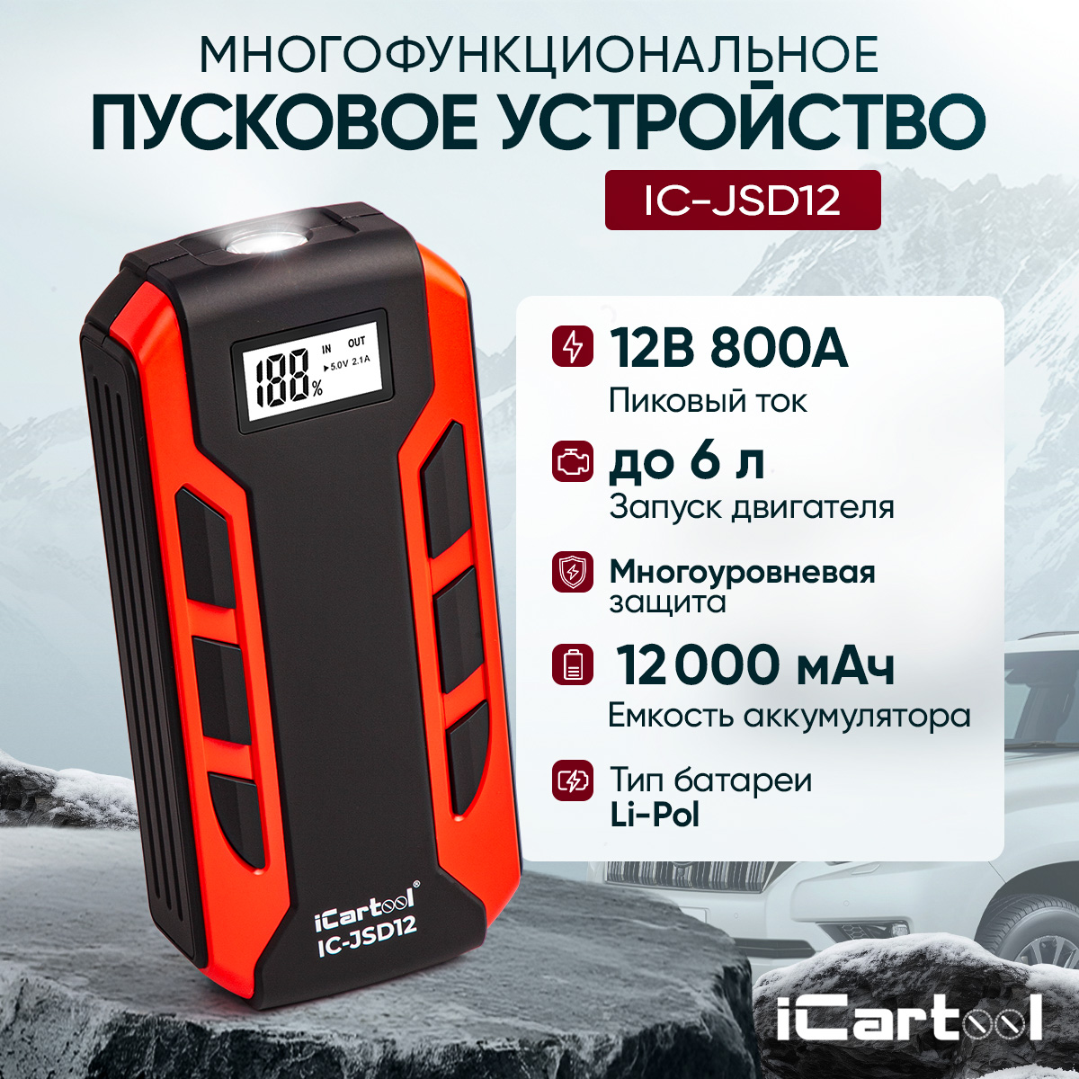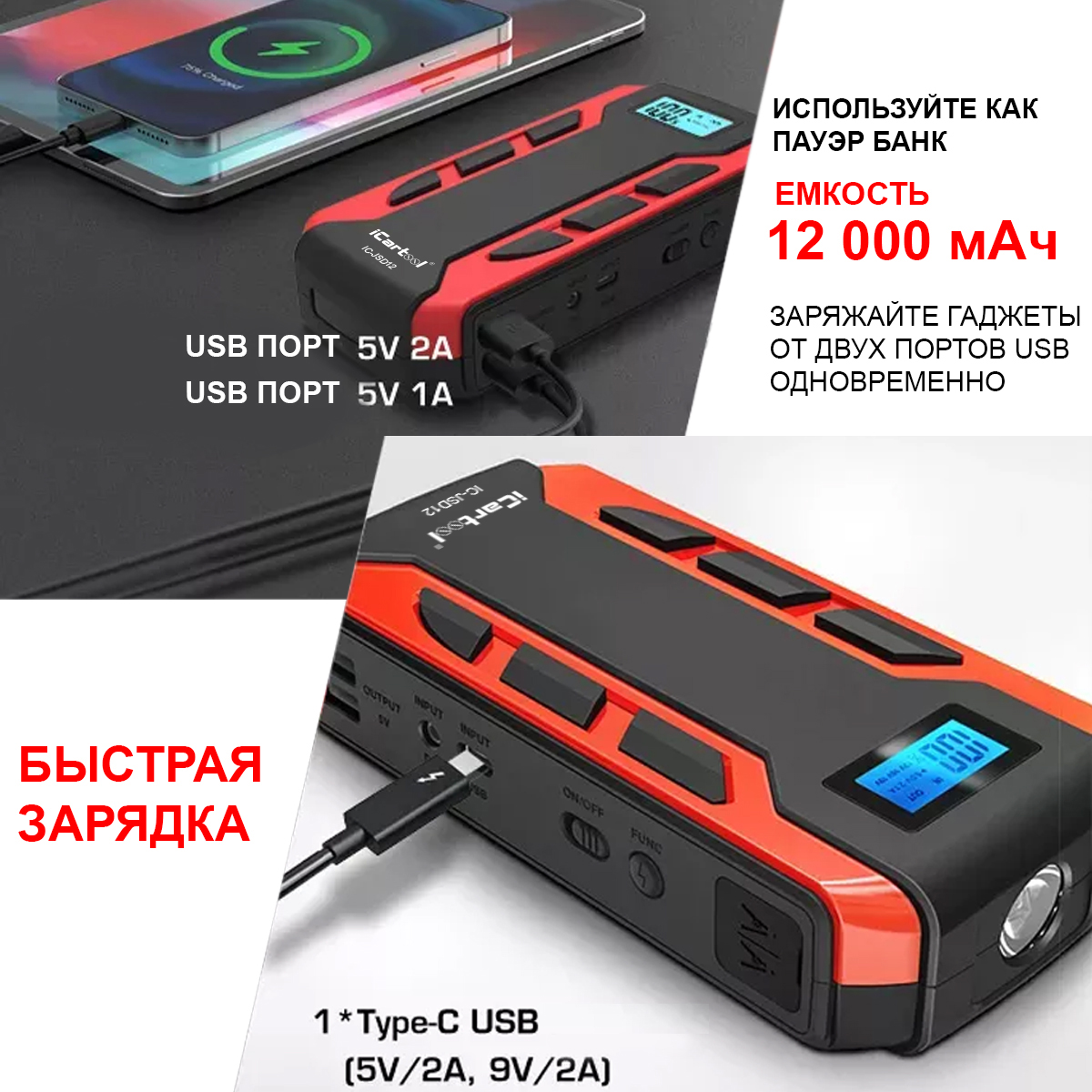 С iCartool IC-JSD12 вы всегда будете уверены в том, что ваш автомобиль заведется, а гаджеты останутся заряженными в любой ситуации!