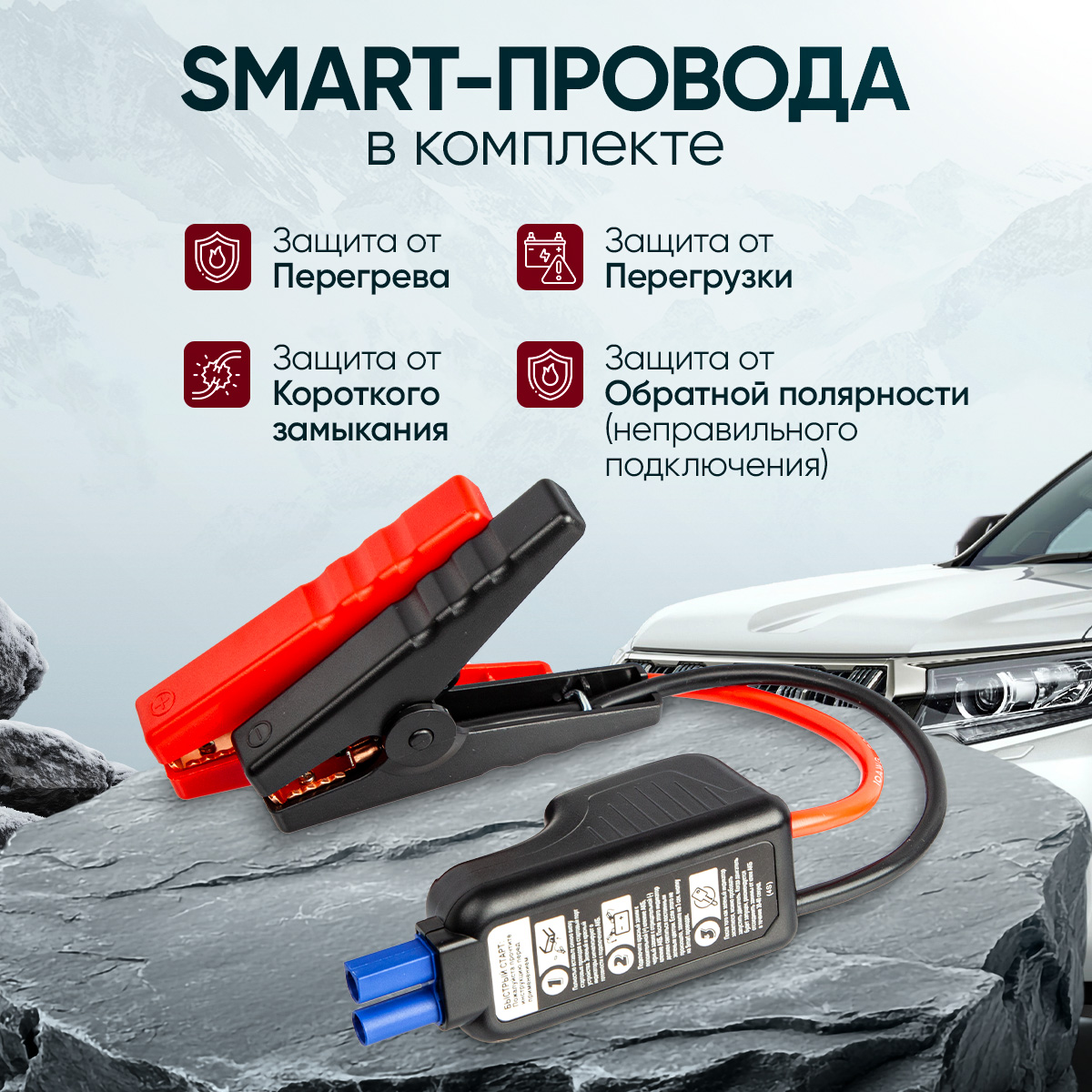 - Устройство комплектуется Smart проводами с встроенной многоуровневой защитой для подключения к АКБ