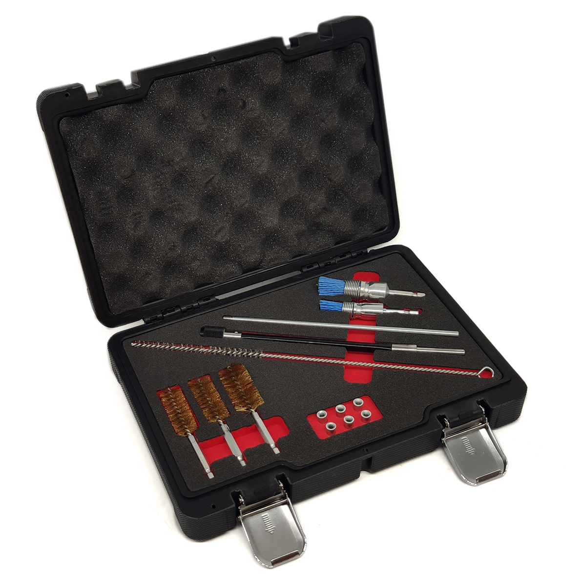 Универсальный набор для чистки форсуночных и свечных колодцев используется для чистки форсуночных и свечных колодцев при проведении ремонтных работ ДВС, а также замене дизельной топливной аппаратуры, свечей накаливания и свечей зажигания на бензиновых ДВС.