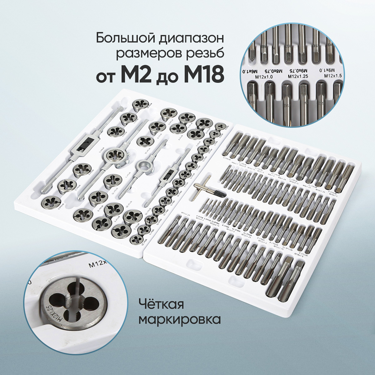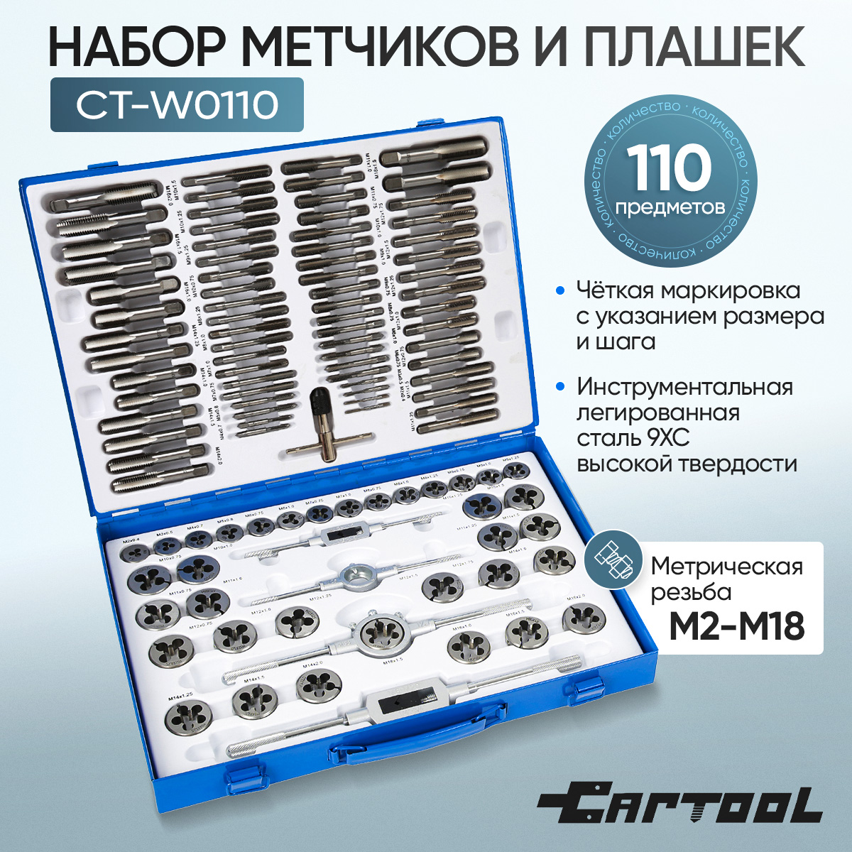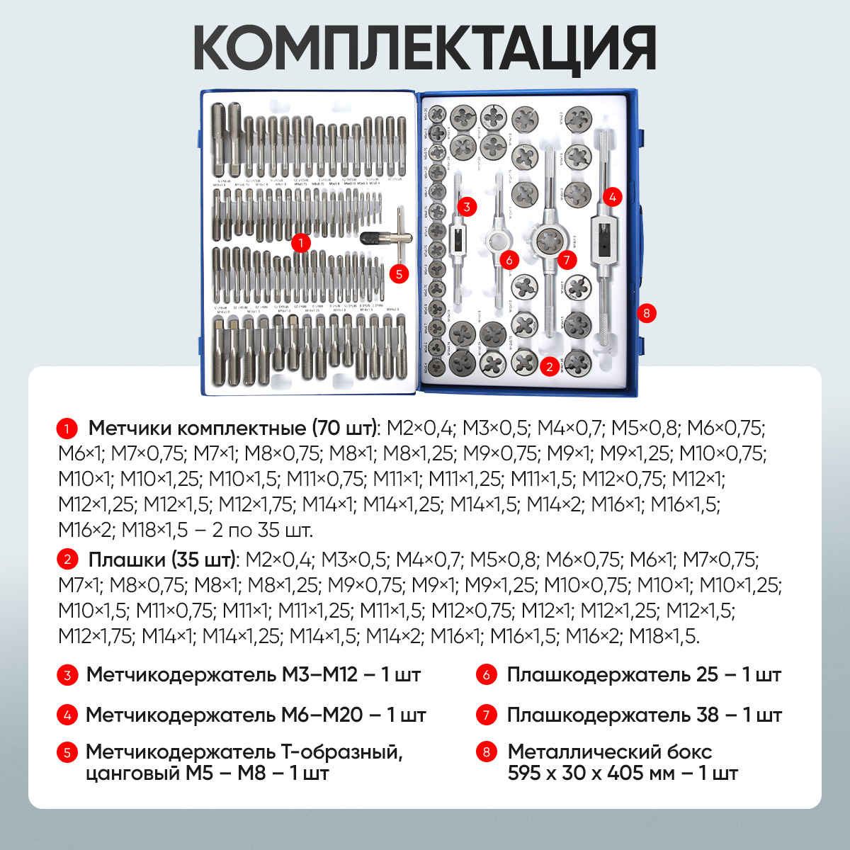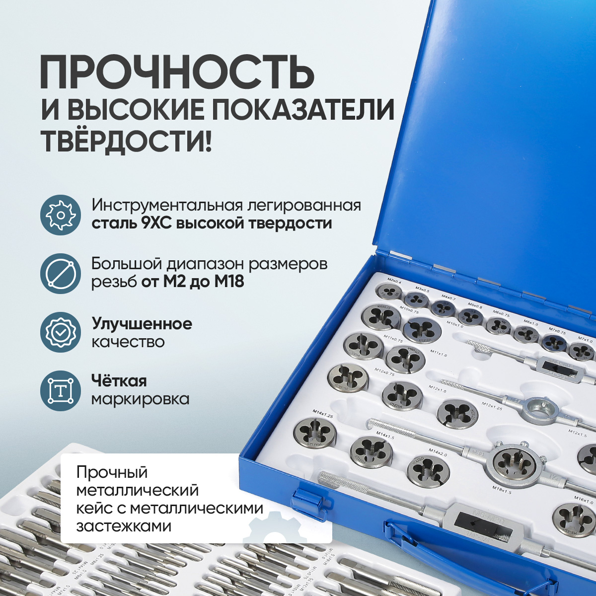 Расширенный набор профессионального резьбонарезного инструмента метрической резьбы М2-М18 для нарезания внутренних и наружных резьб. Инструмент изготовлен из инструментальной легированной стали 9ХС. Набор позволяет работать с цветными металлами и сталью. Набор представлен в металлическом кейсе для удобства транспортировки и хранения. В наборе 110 предметов.