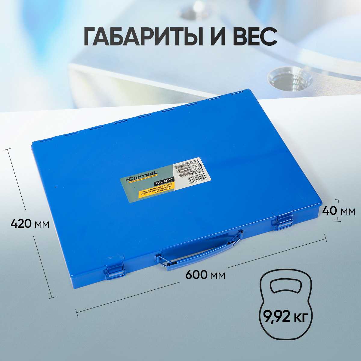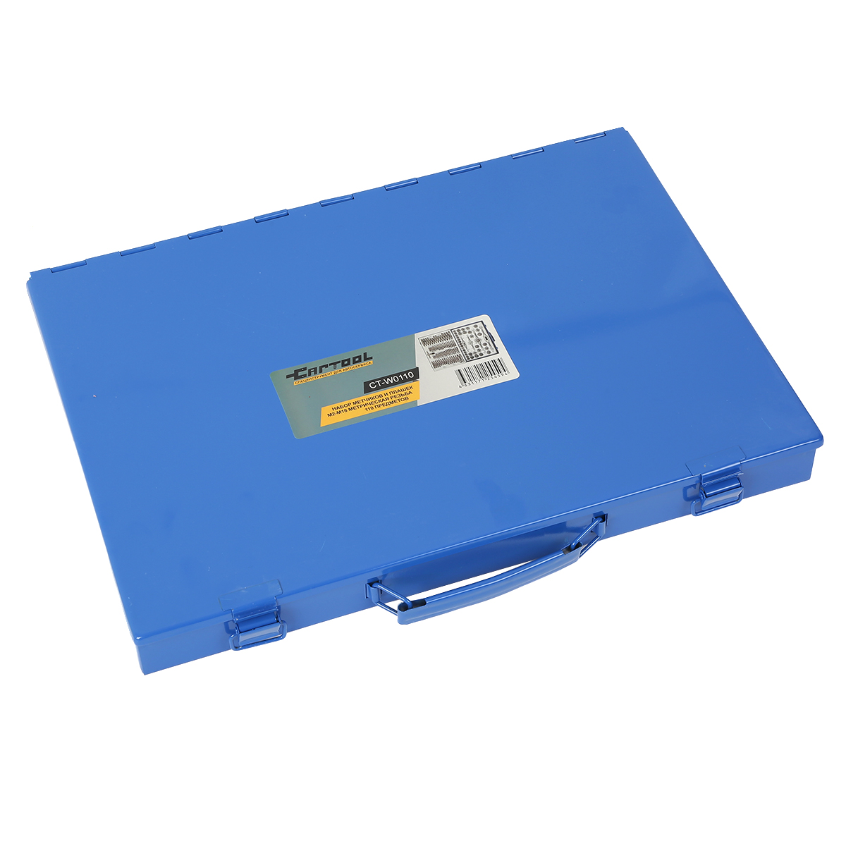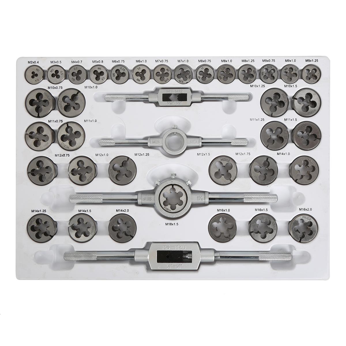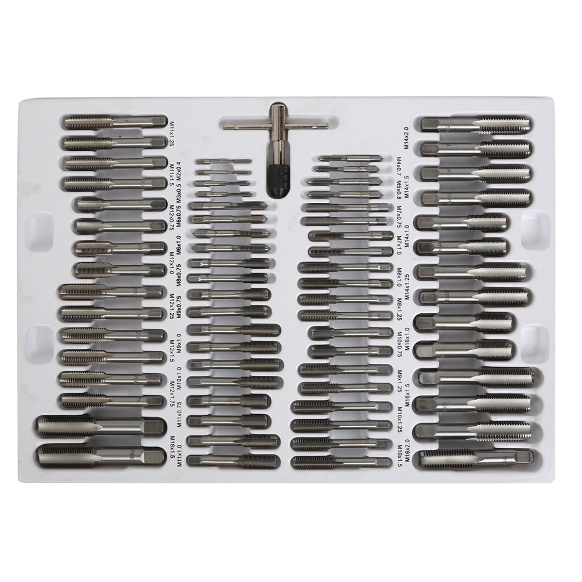 Расширенный набор профессионального резьбонарезного инструмента метрической резьбы М2-М18 для нарезания внутренних и наружных резьб. Инструмент изготовлен из инструментальной легированной стали 9ХС. Набор позволяет работать с цветными металлами и сталью. Набор представлен в металлическом кейсе для удобства транспортировки и хранения. В наборе 110 предметов.