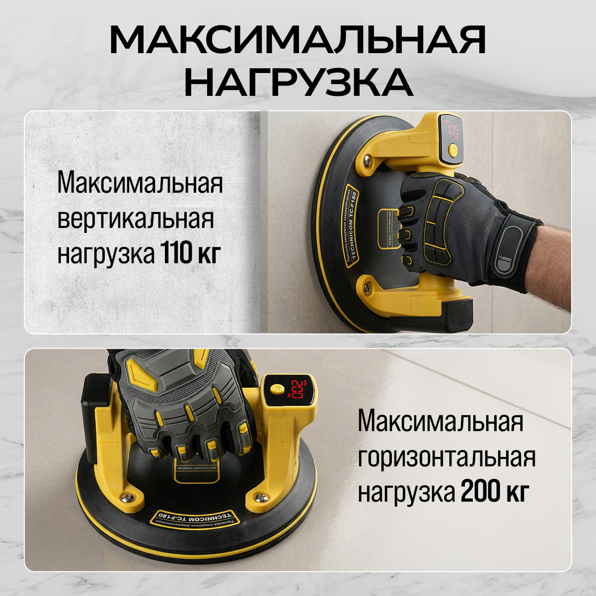 Модель TC-F180 - подходит для переноски всех материалов как с плоской так и шероховатой поверхностью как малых, так и больших размеров. С помощью данной присоски можно осуществлять переноску и укладку стекла, зеркала, ламината, керамогранита, дерева, металла, бетона, пластика. В отличие от обычных помповых присосок TC-F180 выполняет набор вакуума автоматически, посредством помпы в считанные секунды.