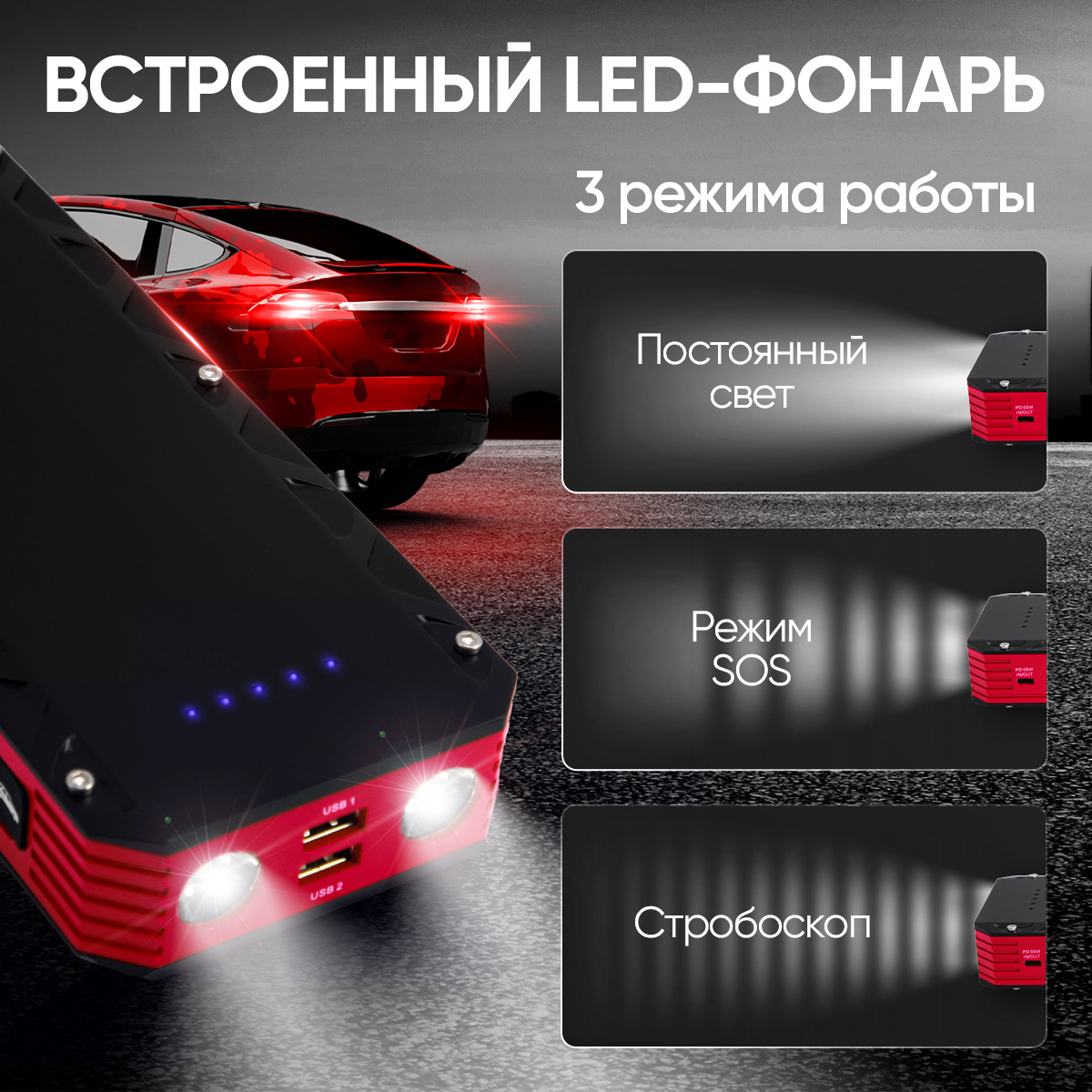 Это и автомобильное пусковое устройство, и портативный источник питания, и светодиодный фонарик на 200 люмен с аварийным стробоскопом и сигналом SOS. Заряжайте смартфоны, планшеты и другие USB-устройства при отсутствии доступа к источнику питания 220В. Также само устройство легко зарядить от USB-порта.