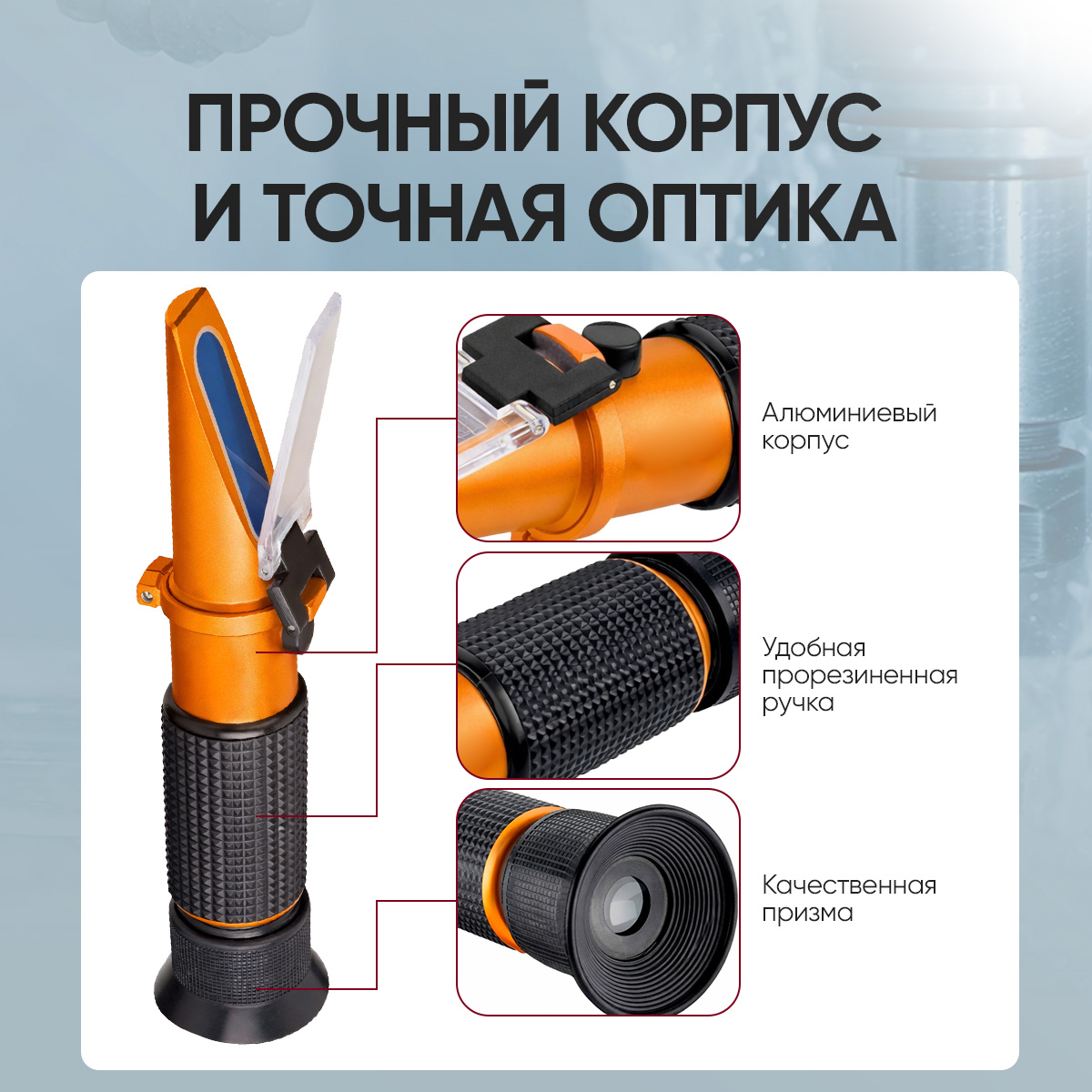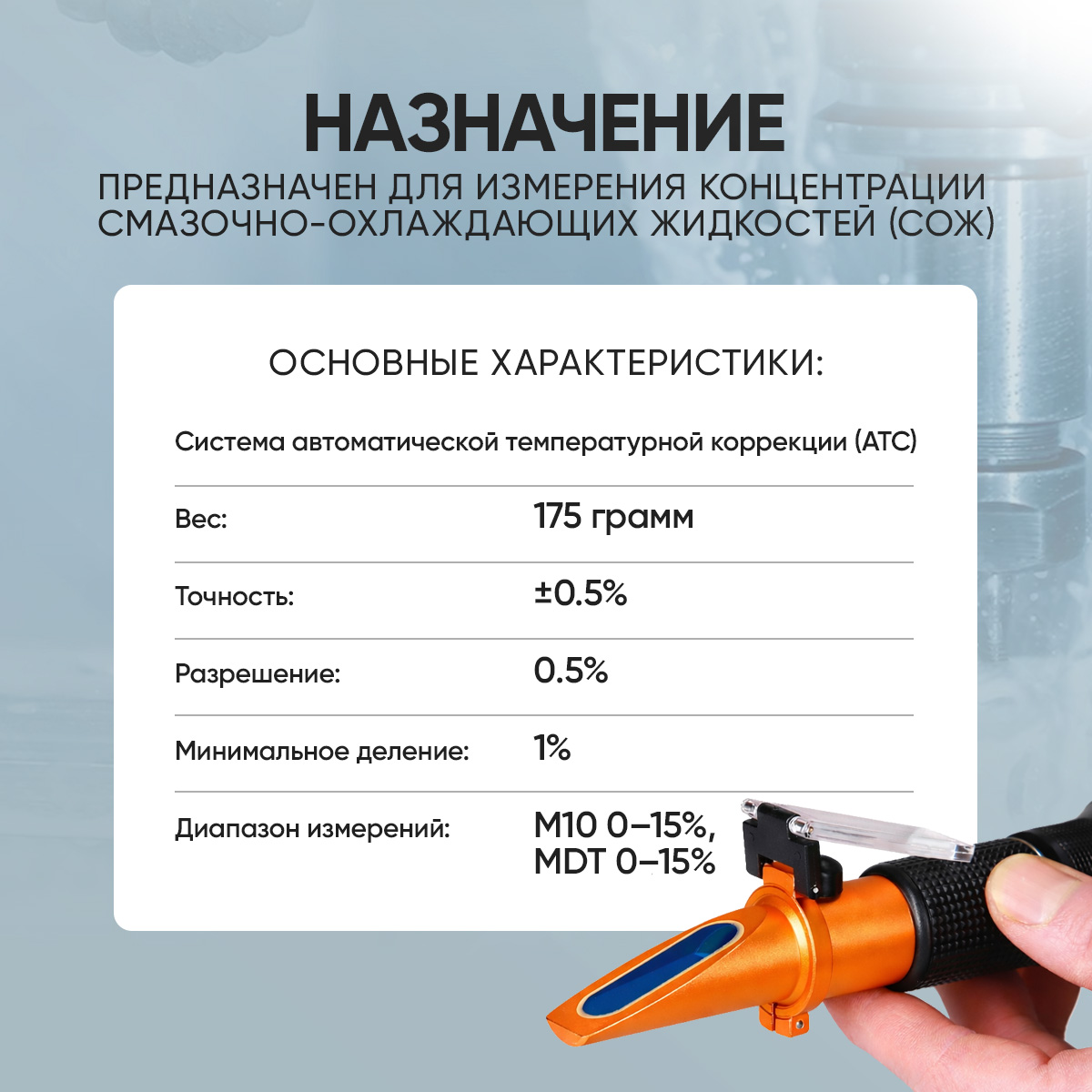 - Две шкалы измерения: M-10 и MDT — удобно для работы с разными типами СОЖ/растворов (используйте шкалу, рекомендованную производителем вашей жидкости)