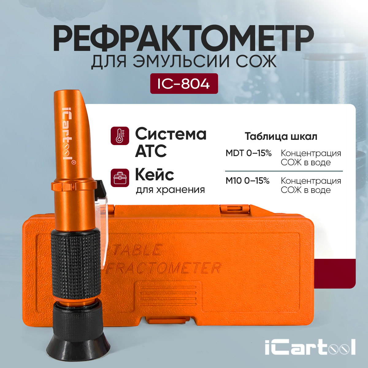 Рефрактометр СОЖ iCartool IC-804 — ручной оптический прибор для контроля концентрации смазочно-охлаждающих жидкостей (водосмешиваемых эмульсий) по принципу преломления света. Он помогает быстро оценить состояние СОЖ на производстве, понять, насколько корректно приготовлена эмульсия, и вовремя заметить ухудшение её свойств.