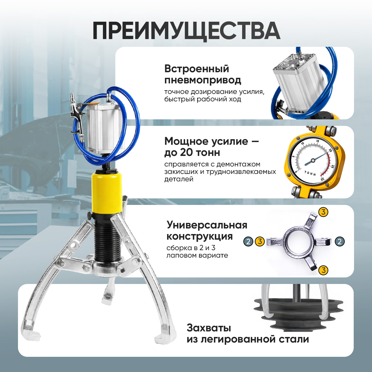 Профессиональный пневмогидравлический съёмник для быстрого и безопасного снятия зубчатых колёс, подшипников, втулок, шкивов и других запрессованных деталей. Работает в конфигурации 2-х или 3-х захватов, что позволяет гибко подстраиваться под узел. Кованая сталь захватов и рамы рассчитаны на долгий ресурс при регулярной эксплуатации. Пневмопривод разгружает оператора и делает процесс управляемым одним человеком.