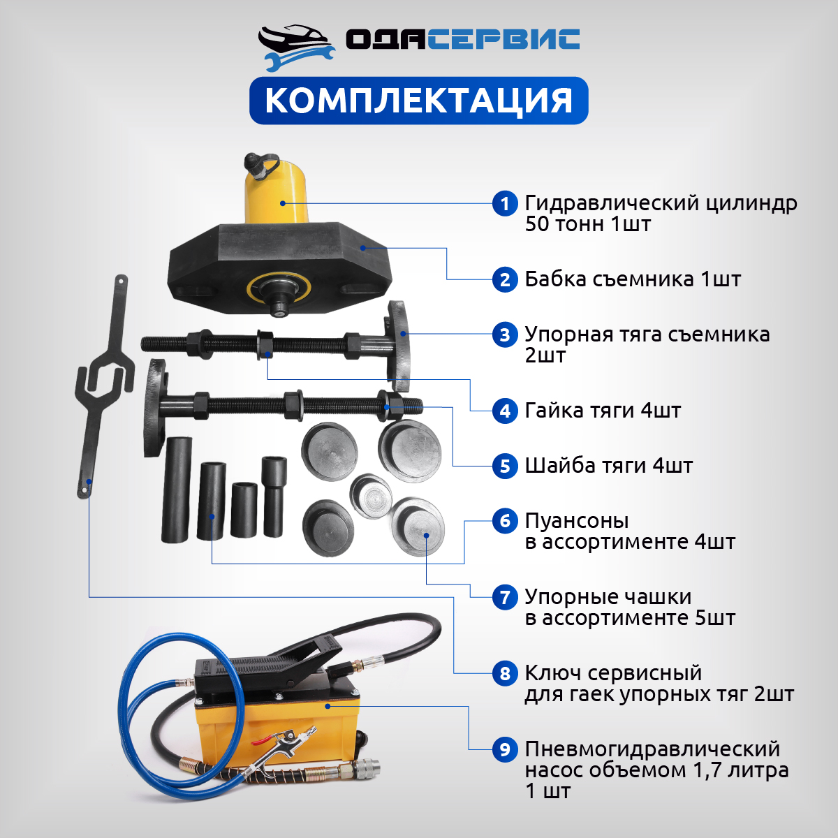 - Масса съемника (гидроцилиндр + бабка+ упорные тяги), кг: 52,5