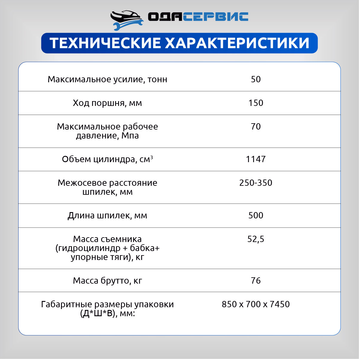 Технические характеристики съемника ступиц ODA-ST5010G