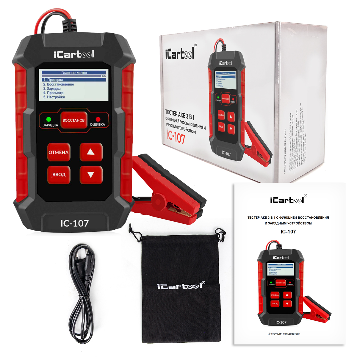 iCartool IC-107 - многофункциональный тестер для обслуживания вашего аккумулятора сочетающий в себе 3 функции. С его помощью вы можете: проверить уровень заряда и общее состояние аккумулятора, провести тесты системы заряда и пуска двигателя зарядить аккумулятор восстановить аккумулятор (устранить сульфатацию пластин).