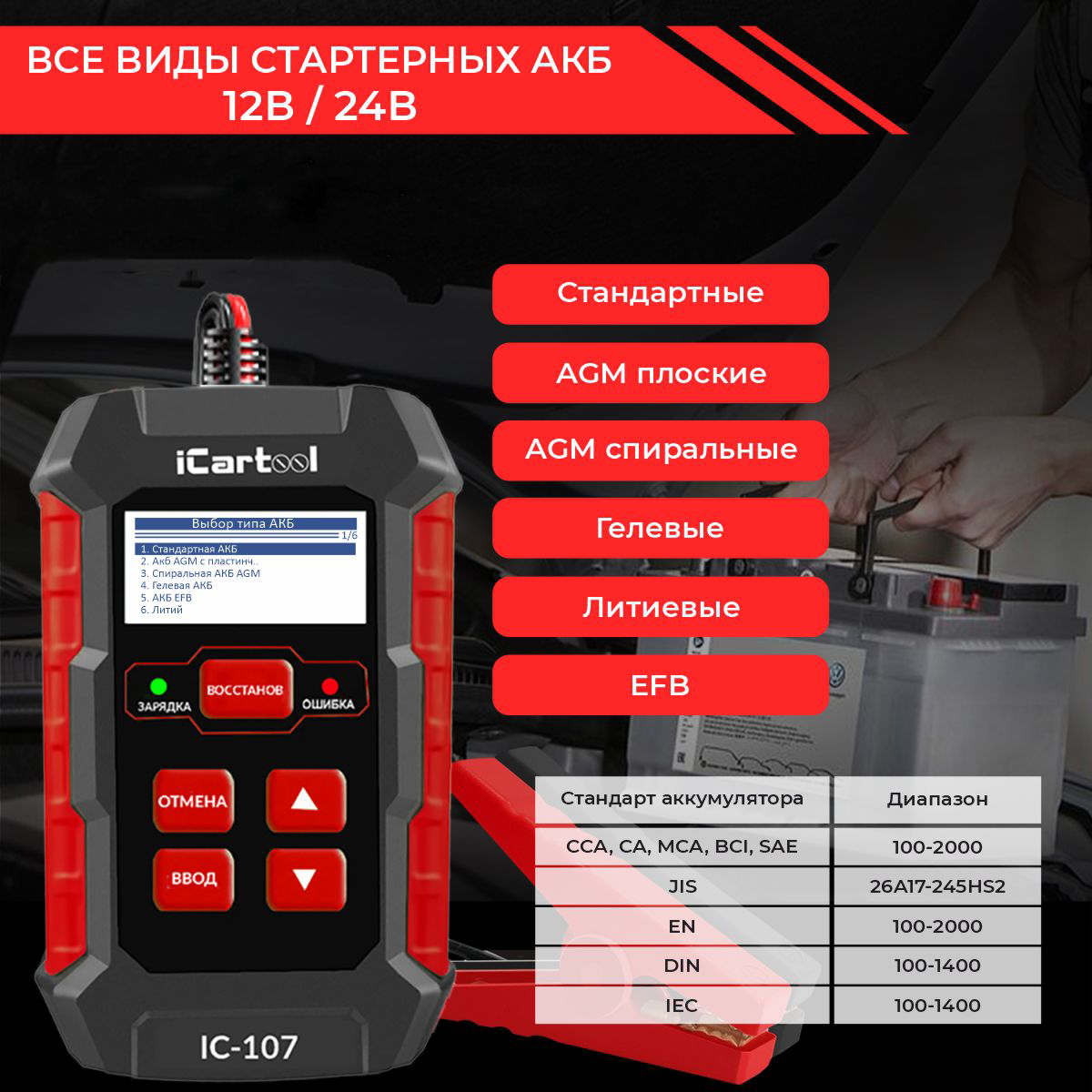 | Поддерживаемые стандарты АКБ | CCA, IEC, EN, DIN, CA, BCI, MCA, SAE, GB, JIS | ||