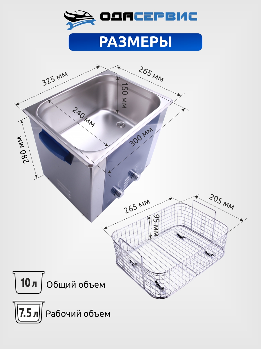 *Обратите внимание: объем ванны указанный в Наименовании, заводом изготовителем, рассчитывается по формуле ДхШхГ, где Д (длина) и Ш (ширина) измеряются по верхней внутренней границе бака, Г ( глубина) максимальное расстояние от верхней кромки бака до его дна. Реальный объем ванны в литрах, отличаться от заявленного, т.к. конструкция бака конусообразная. При выборе ультразвуковой ванны ориентируйтесь на ее рабочий объем.