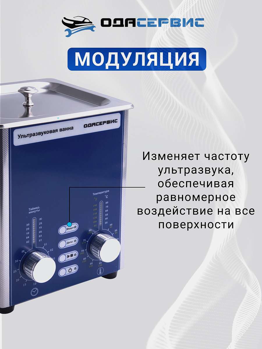 ODA-DS100 - это ультразвуковая ванна с аналоговым управлением, подогревом, с функциями дегазации (повышает КПД) и модуляции (оптимальное распределение частоты) объемом 10 литров.