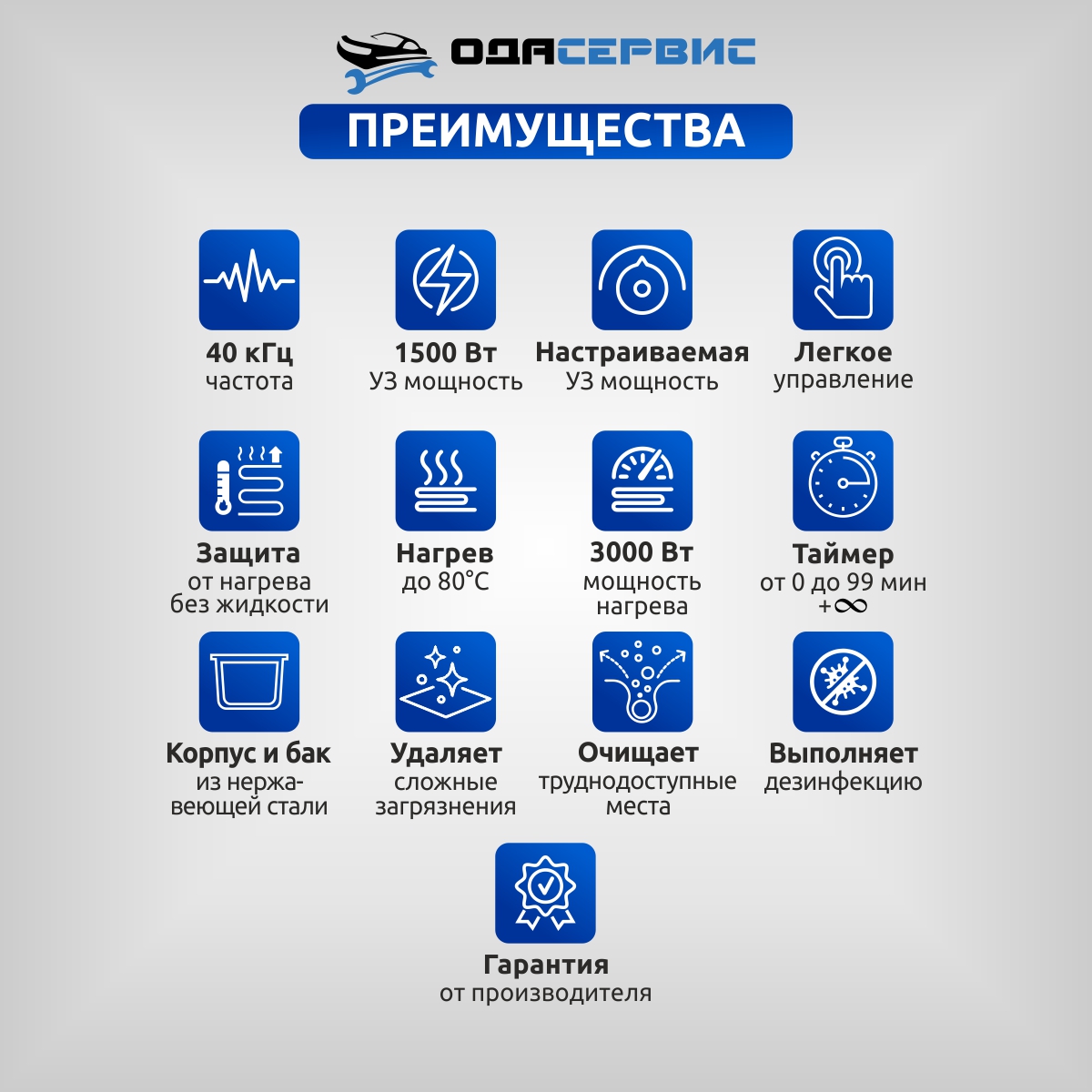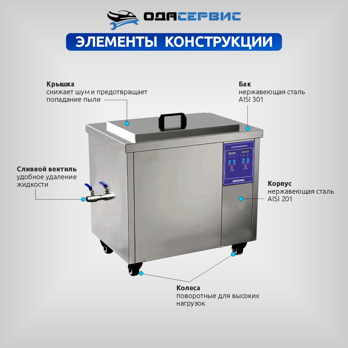 ОДА Сервис ODA-LQ1080 — это промышленная ультразвуковая ванна на 108 литров с регулировкой мощности ультразвука, электронным таймером и подогревом. Такие ванны имеют широкий спектр применения, от мойки крупных и не очень деталей в автосервисе, до использования на производстве.