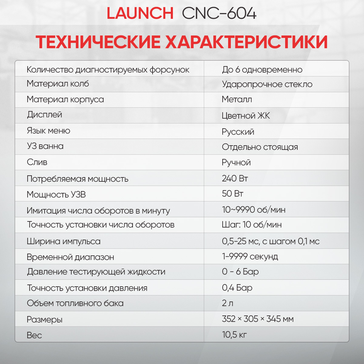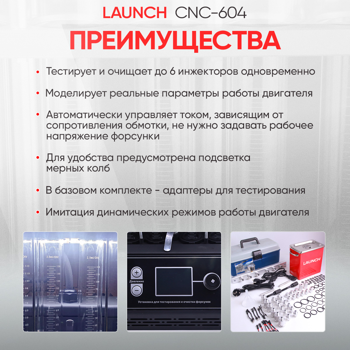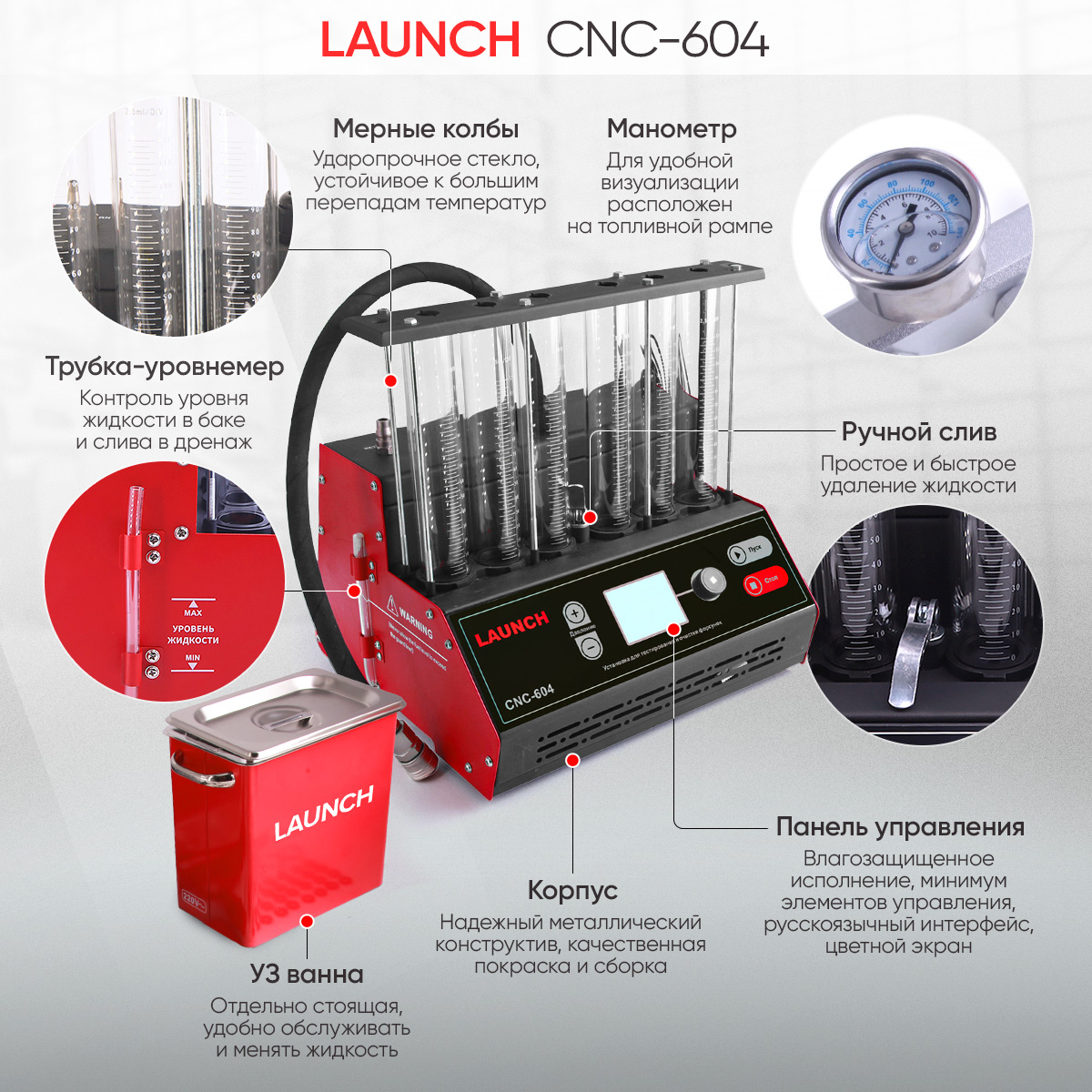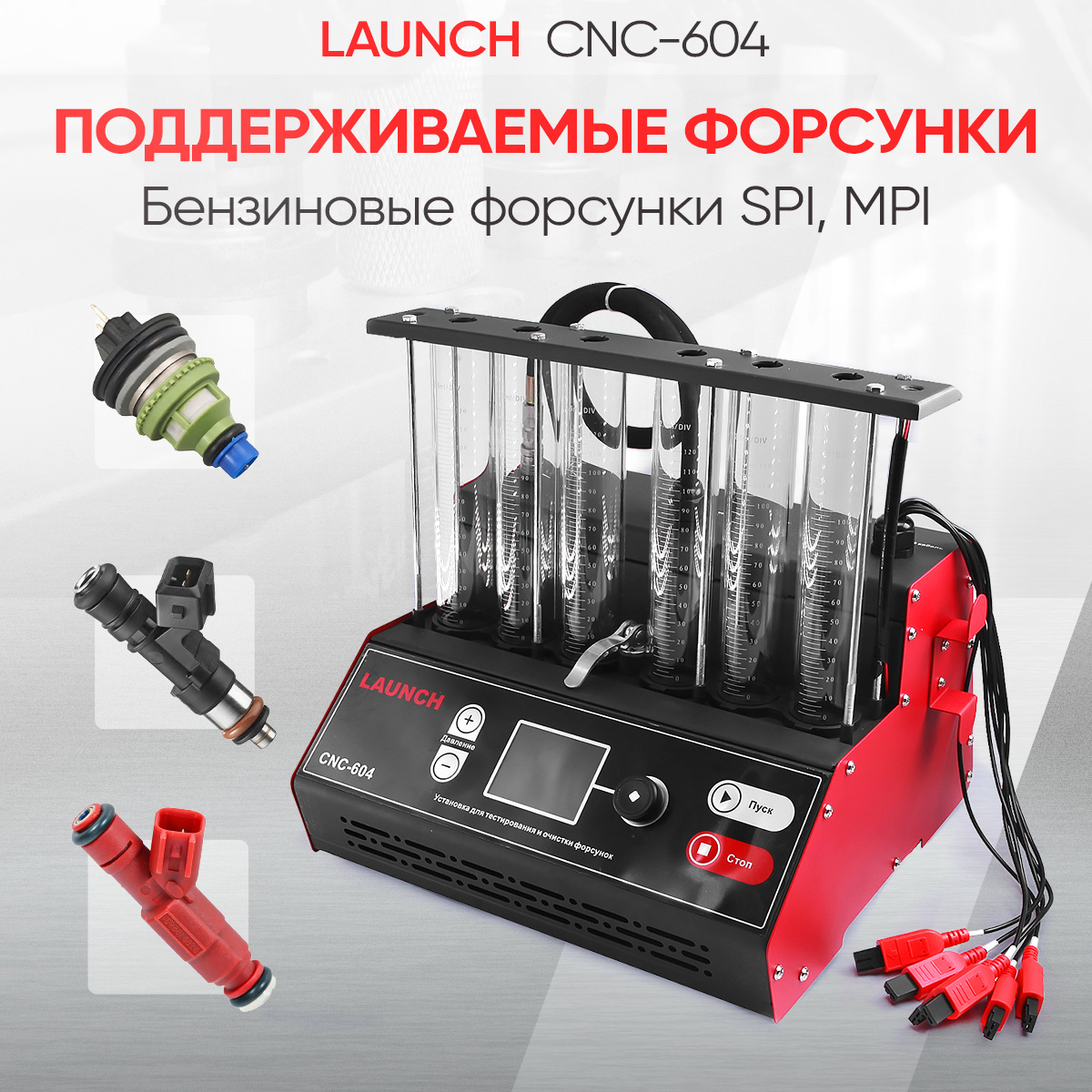 Стенд Launch CNC-604 предназначен для работы с бензиновыми форсунками с верхней подачей топлива. Передняя панель влагозащищенная. Удобный цифровой цветной дисплей делает работу еще более комфортной.