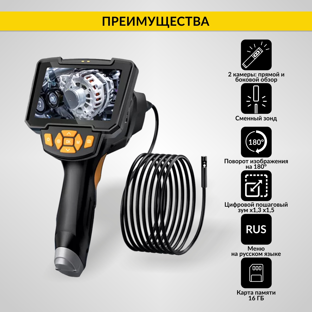 В комплект входит USB-кабель для зарядки и дополнительные насадки (крюк и магнит), которые крепятся к зонду с помощью резьбового соединения, что предотвращает их потерю. Эти насадки расширяют функциональность эндоскопа: крюк для работы с электропроводкой и магнит для извлечения металлических предметов.