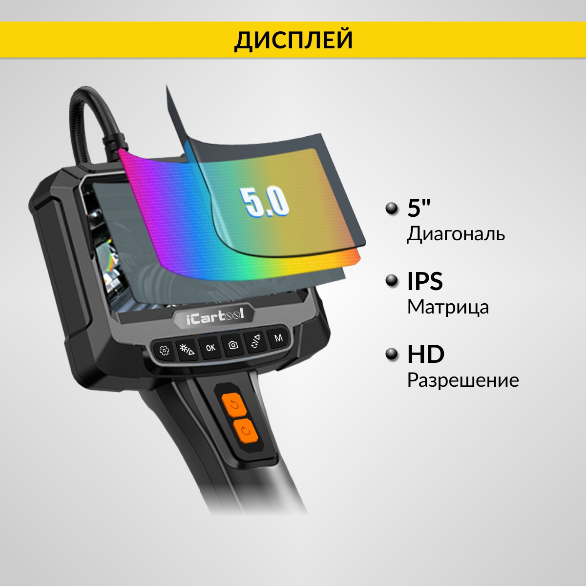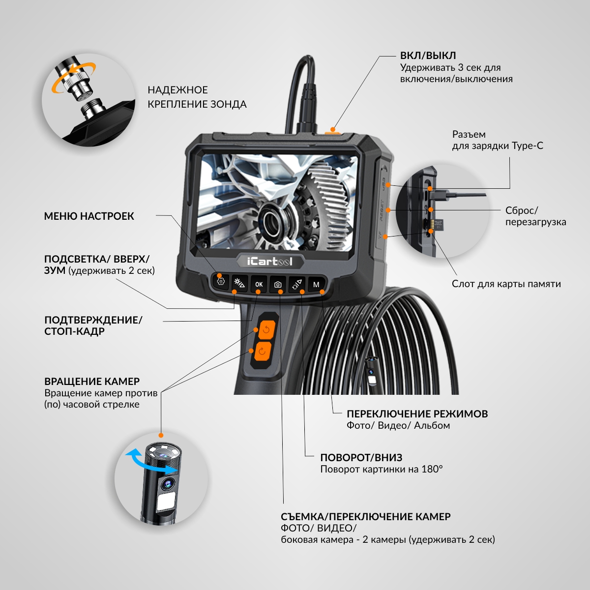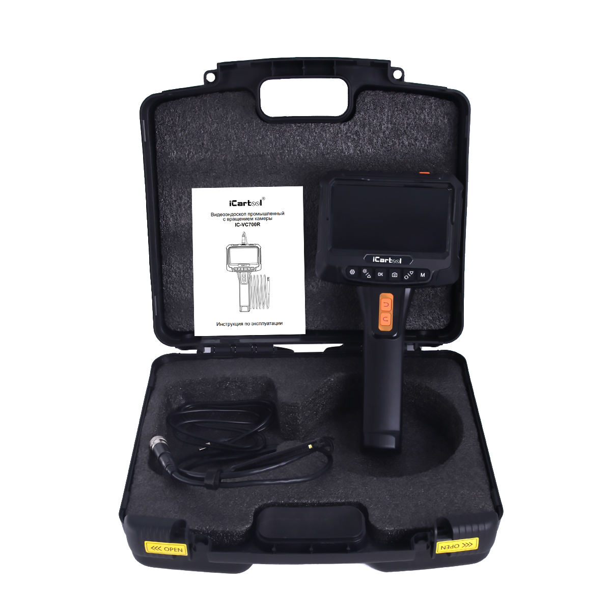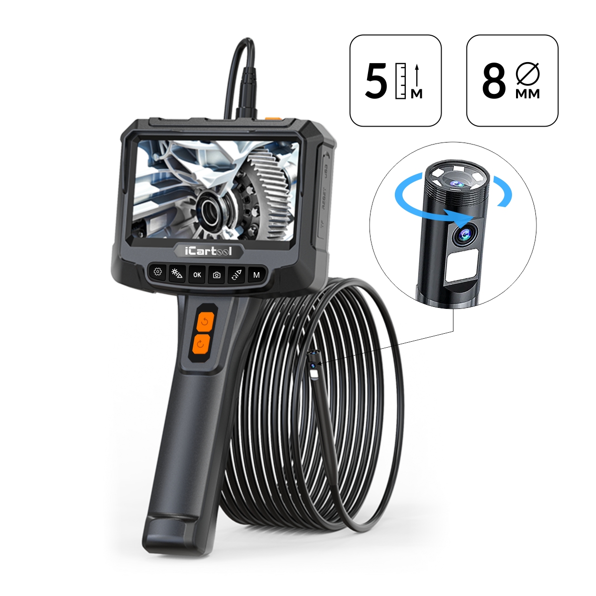 Промышленный видеоэндоскоп с вращением камеры iCartool IC-VC700R-5 имеет 2 камеры и IPS-экран 5” с разрешением HD. Главная особенность видеоэндоскопа – возможность управлять положением боковой камеры, вращая её на угол до ±350 градусов для кругового обзора с помощью кнопок. Идеально подходит для использования в таких отраслях, как машиностроение, строительство, энергетика и ремонт.