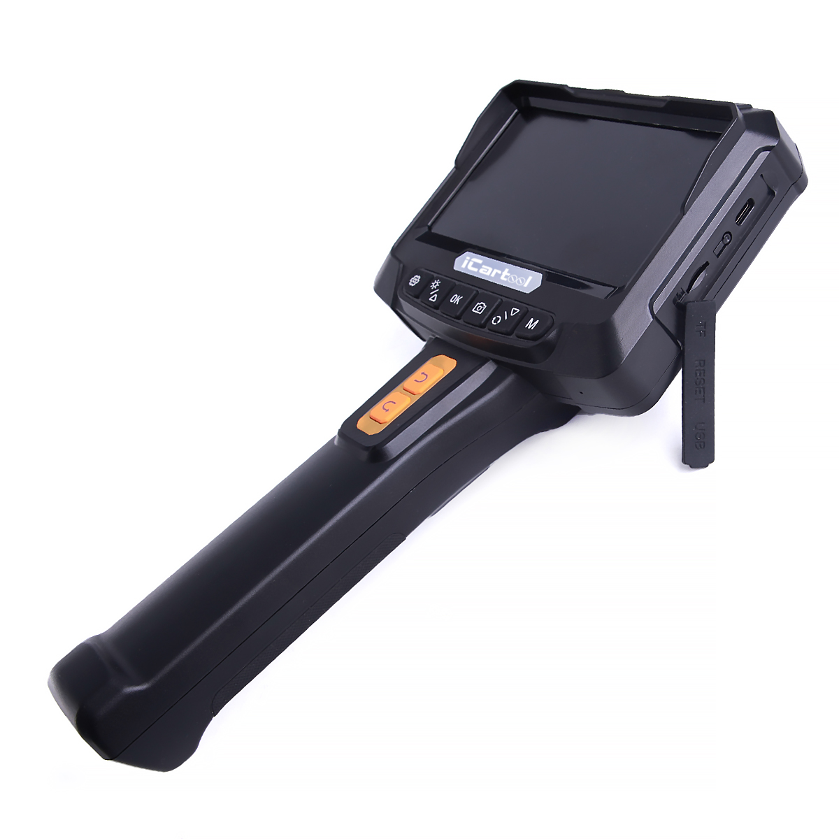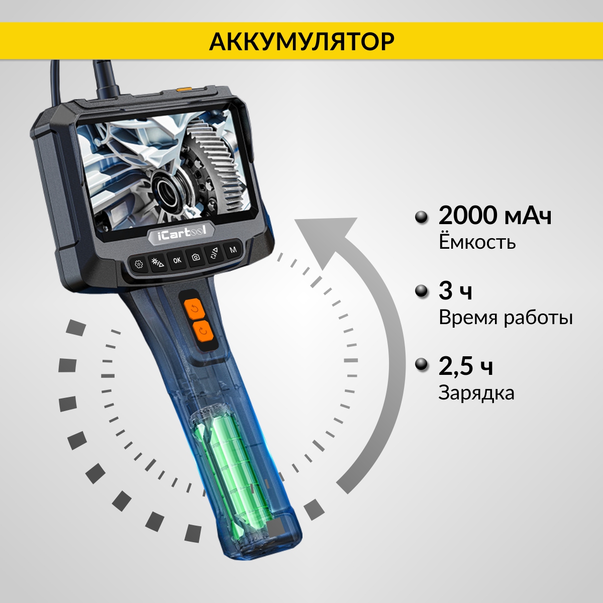 Переключение между камерами, а также использование дополнительных функций происходит с помощью кнопочной панели управления. Регулируемая LED-подсветка обеспечивает возможность детального осмотра объекта. Встроенная литиевая батарея позволяет работать до 3х часов без подзарядки.