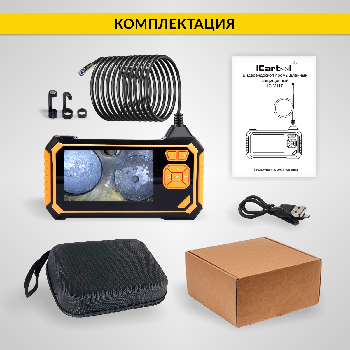 Видеоэндоскоп iCartool IC-V117 в противоударном корпусе оснащен двумя камерами Full HD, что обеспечивает точную диагностику узлов и клапанов ДВС без использования дорогих управляемых зондов. Зонд диаметром 5,5 мм и длиной 3 м с защитой IP67 и комплектом насадок позволяет работать в самых труднодоступных местах. Купить промышленный видеоэндоскоп iCartool выгодно — это надежный инструмент для автосервисов и промышленности с временем работы до 3 часов от одной зарядки.