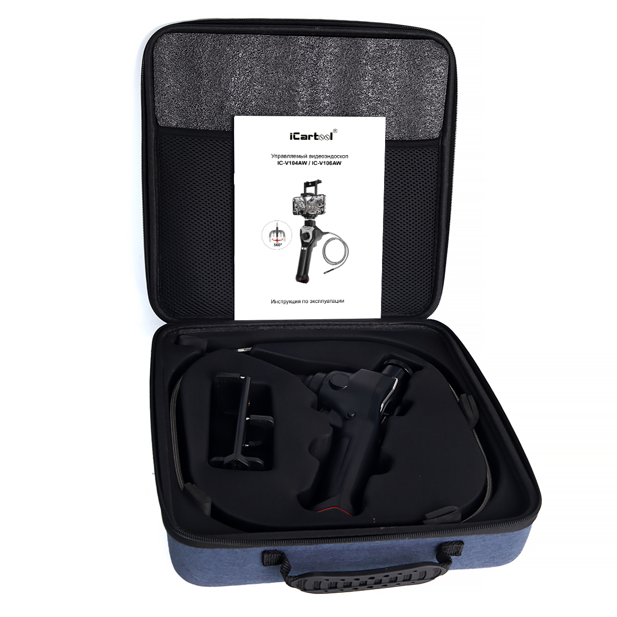 Камера с разрешением 1 Мп имеет автоматическую фокусировку в диапазоне от 1 см. Для работы в темных местах предусмотрена регулируемая LED подсветка с 3 уровнями яркости. Корпус эндоскопа легкий, удобно лежит в руке, оснащен собственным аккумулятором для продолжительной работы. Держатель смартфона съемный, имеет 2 варианта крепления к корпусу (вертикально и горизонтально) и надежно удерживает мобильное устройство (телефон/планшет) шириной до 18 см.
