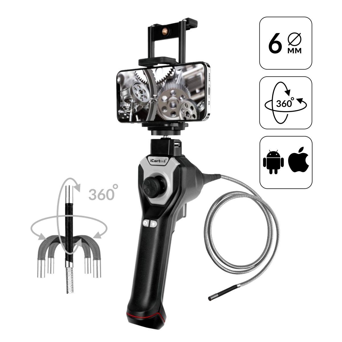 Видеоэндоскоп iCartool IC-V106AW с артикуляцией 360° и управлением джойстиком обеспечивает панорамный обзор труднодоступных зон. HD-камера с автофокусом от 1 см и LED подсветкой дает четкое изображение даже в темных местах. Прочный зонд с вольфрамовой оплеткой, защита IP67 и работа от аккумулятора делают прибор надежным инструментом для автодиагностики и промышленного использования.