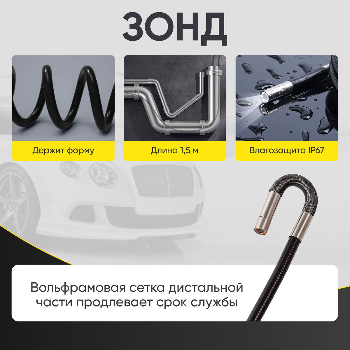 Гибкий зонд диаметром 6 мм и длиной 1,5 метра помогает добраться туда, где стандартные модели с зондом 1 метр уже не справляются. Увеличенная длина позволяет выполнять осмотр глубже и точнее, сокращает количество дополнительных манипуляций и экономит время при диагностике.
